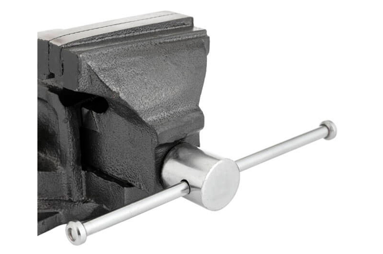 Тиски слесарные HT-0081 предназначены для закрепления заготовок, предметов и деталей для дальнейшей их обработки. Конструкция с металлической наковальней расширяет функционал тисков и позволяет выполнять небольшие ударные работы над изделием. Поворотная база дает возможность разворачивать и неподвижно фиксировать заготовку в диапазоне 360 градусов вокруг своей оси для удобства выполнения работ. Закаленные губки с зубчатой поверхностью обеспечивают надежный захват и износостойкость рабочей поверхности. Тиски можно установить стационарно с помощью отверстий в базе. Долговечные и прочные Тиски изготовлены из чугуна, отличаются своей прочностью и жесткостью конструкции. Покрыты стойкой к деформации порошковой краской против химических, механических и атмосферных воздействий. Удобная работа Большая наковальня (в соотношении с общими габаритами тисков) позволяет комфортно проводить небольшие слесарные работы с применением ударов. Зубчатые губки закаленные надежно фиксируют изделие и предупреждают проскальзывание. Отличаются повышенной износостойкостью, что дает возможность выполнять более тяжелые работы. Поворотная база расширяет возможности фиксации деталей в горизонтальной плоскости на 360 градусов вокруг своей оси - вы можете зафиксировать заготовку в любом удобном для работы положении. Особенности: Материал корпуса: чугун; Покрытие: стойкая к деформации порошковая краска; Большая наковальня; Зубчатые губки из закаленной стали; Поворотная база, 360 градусов; Полированные рукоятки. Размер наковальни: 65/40 мм; Тип губок: съемные; Основа: поворотная; Высота губок: 20 мм; Ширина губок: 100 мм; Ширина захвата: 100 мм
