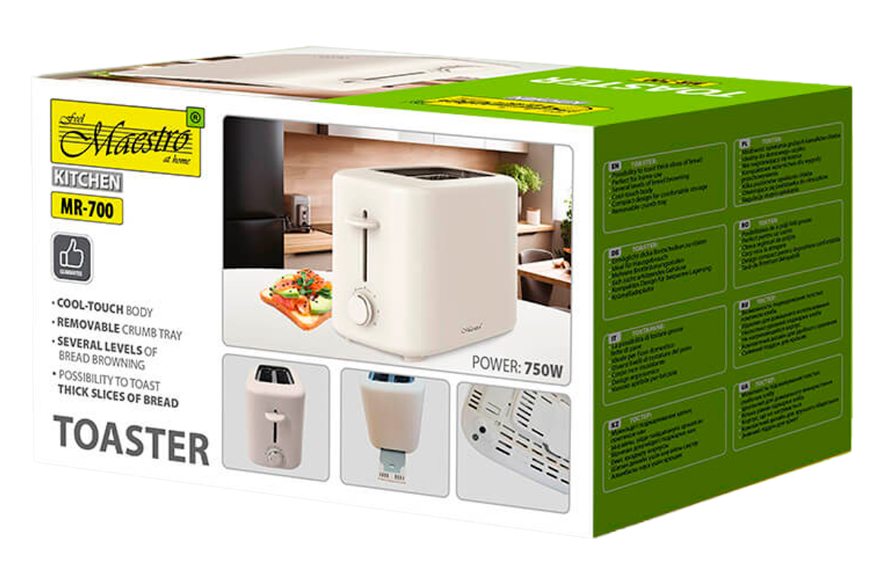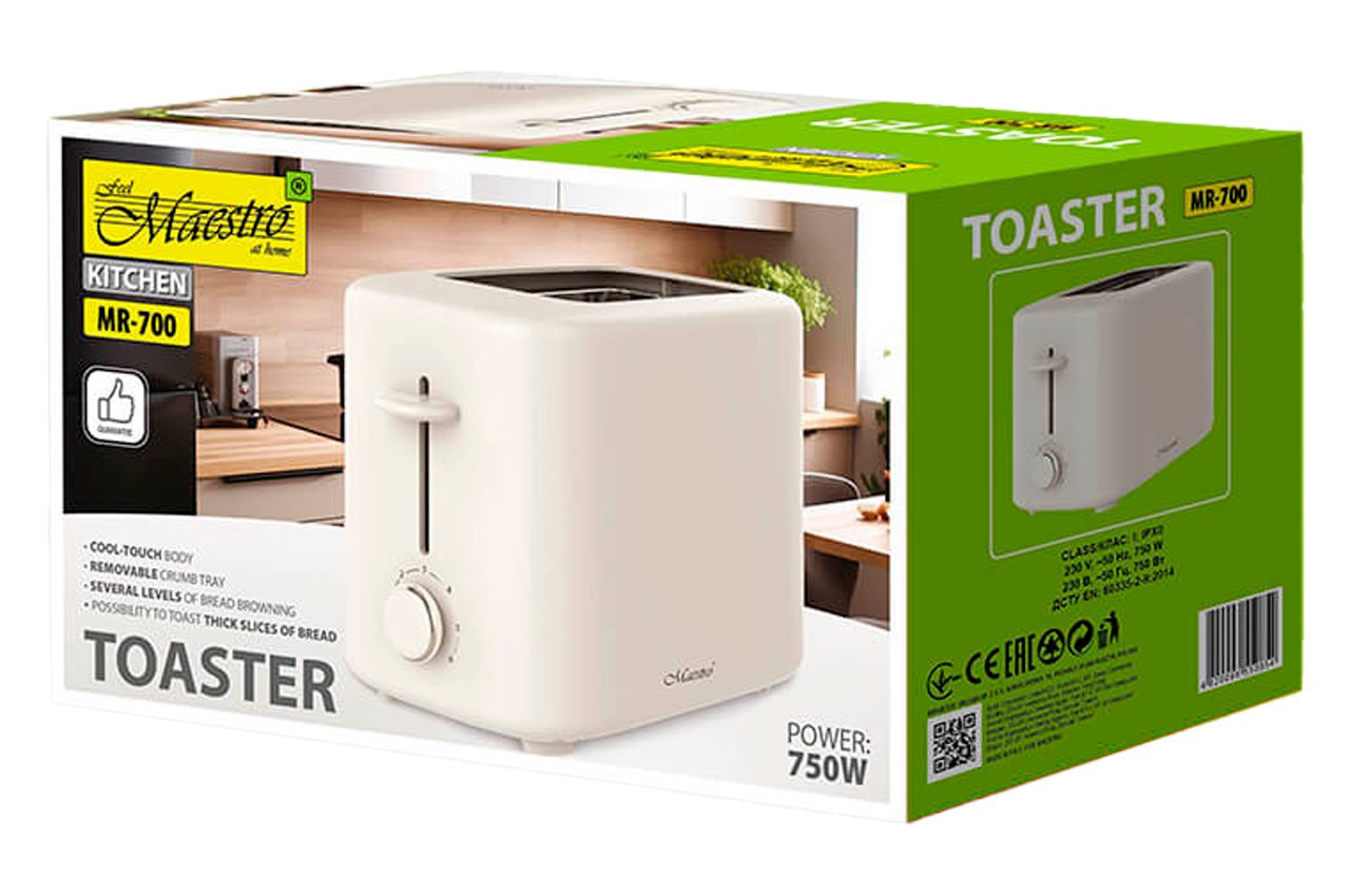 Тостер Maestro MR 700 мощностью 750 Вт с 6 режимами прожарки выпускается в удобном пластиковом корпусе белого цвета. В торце корпуса расположены ручка переключатель режимов и кнопка "стоп". Тостер предназначен для поджарки кусочков хлеба с возможностью образования хрустящей корочки.