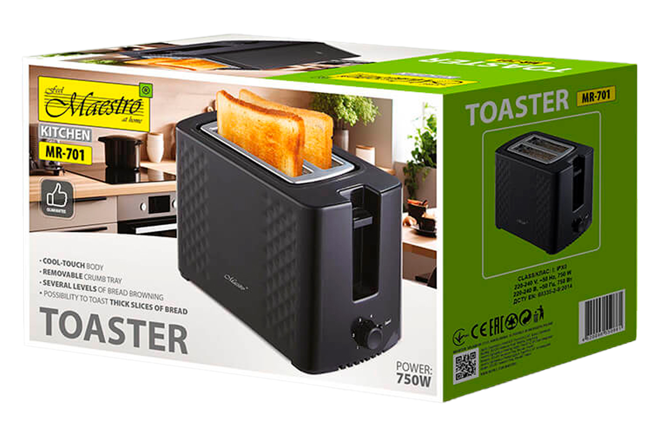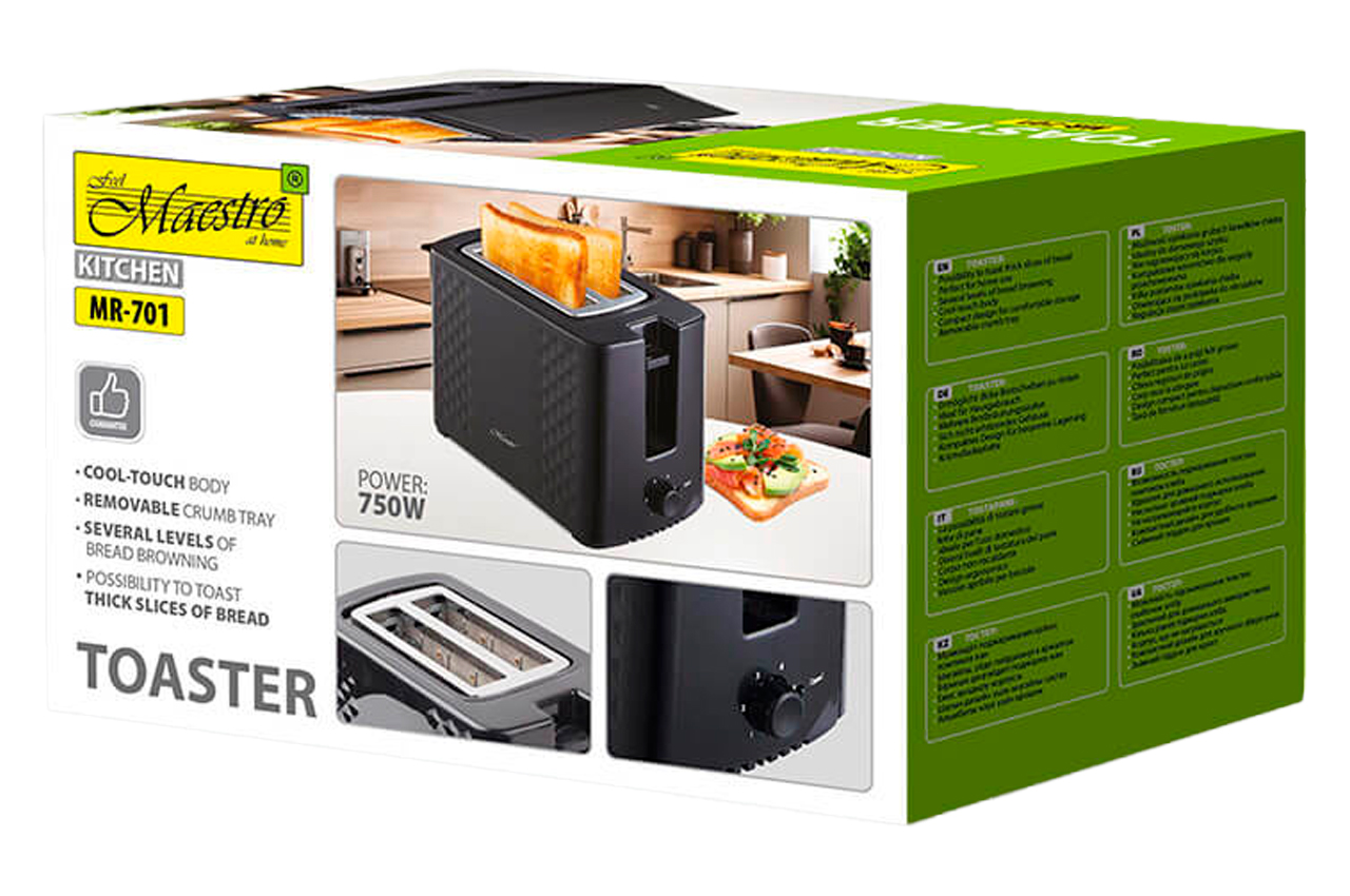 Тостер Maestro MR 701 мощностью 750 Вт со встроенной подставкой для булочек имеет 6 режимов прожарки выпускается в удобном пластиковом корпусе черного цвета со стальной вставкой. В торце корпуса расположены ручка переключатель режимов и кнопка "стоп". Тостер предназначен для поджарки кусочков хлеба с возможностью образования хрустящей корочки.