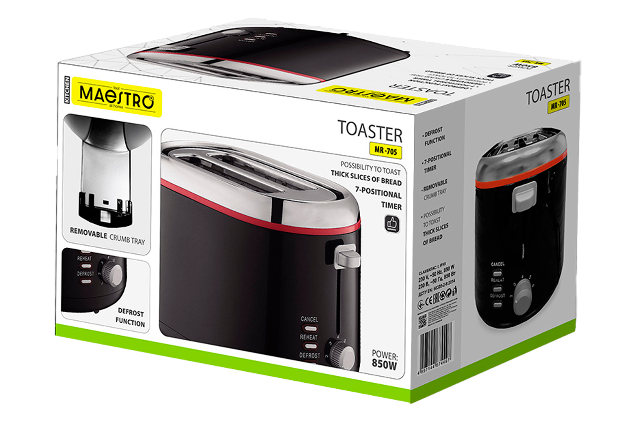 Стильный дизайн, не нагревающийся корпус, простое удобное использование, возможность поджаривания толстых ломтиков хлеба, емипозиционный таймер, открывающийся поддон для крошек, функция отмены, функции: "Подогрев", "размораживание"