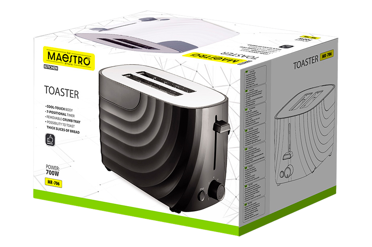 Тостер Maestro MR 706 мощностью 700 Вт имеет 7 режимов прожарки, выпускается в удобном пластиковом корпусе белого либо черного цвета. В торце корпуса расположены ручки выбора режимов и кнопка "отмена". Тостер предназначен для поджарки кусочков хлеба с возможностью образования хрустящей корочки.