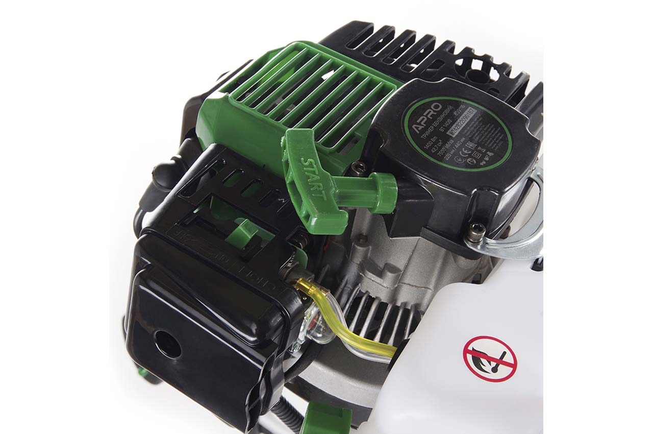 Выбирая по уходу за газоном триммер бензиновый APRO ВТ 1400, можно смело рассчитывать на его длительную службу. Все активные узлы выполнены из металла и имеют хороший ресурс при правильном использовании. То есть следить за тем, чтобы нож не попадал по камню, бордюру. Работает мотокоса на двухтактном двигателе с мощностью 1400 Вт. Этого достаточно, чтобы обслуживать достаточно широкие территории вокруг дома. Инструмент оснащен крепкой трубой, широко расставленными рукоятками и ремнем на плече, что позволяет пользователю с комфортом управлять косой. Потребление бензина минимальное, поскольку двигатель имеет объем 42,7 см. куб.