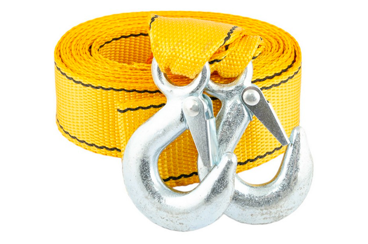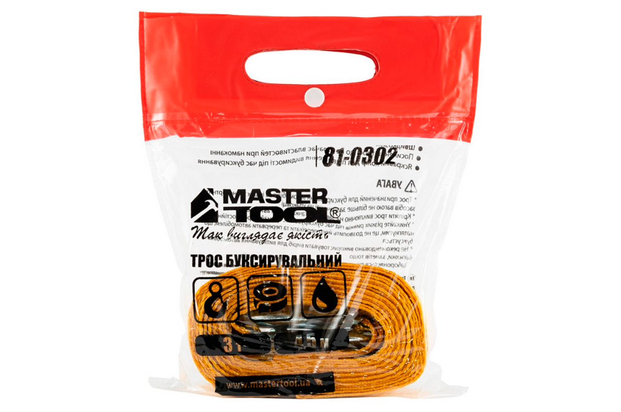 Трос буксировочный Mastertool – используется для буксировки транспортных средств. Нагрузка 3 т; Длина 4,5 м; Ширина: 50 мм.