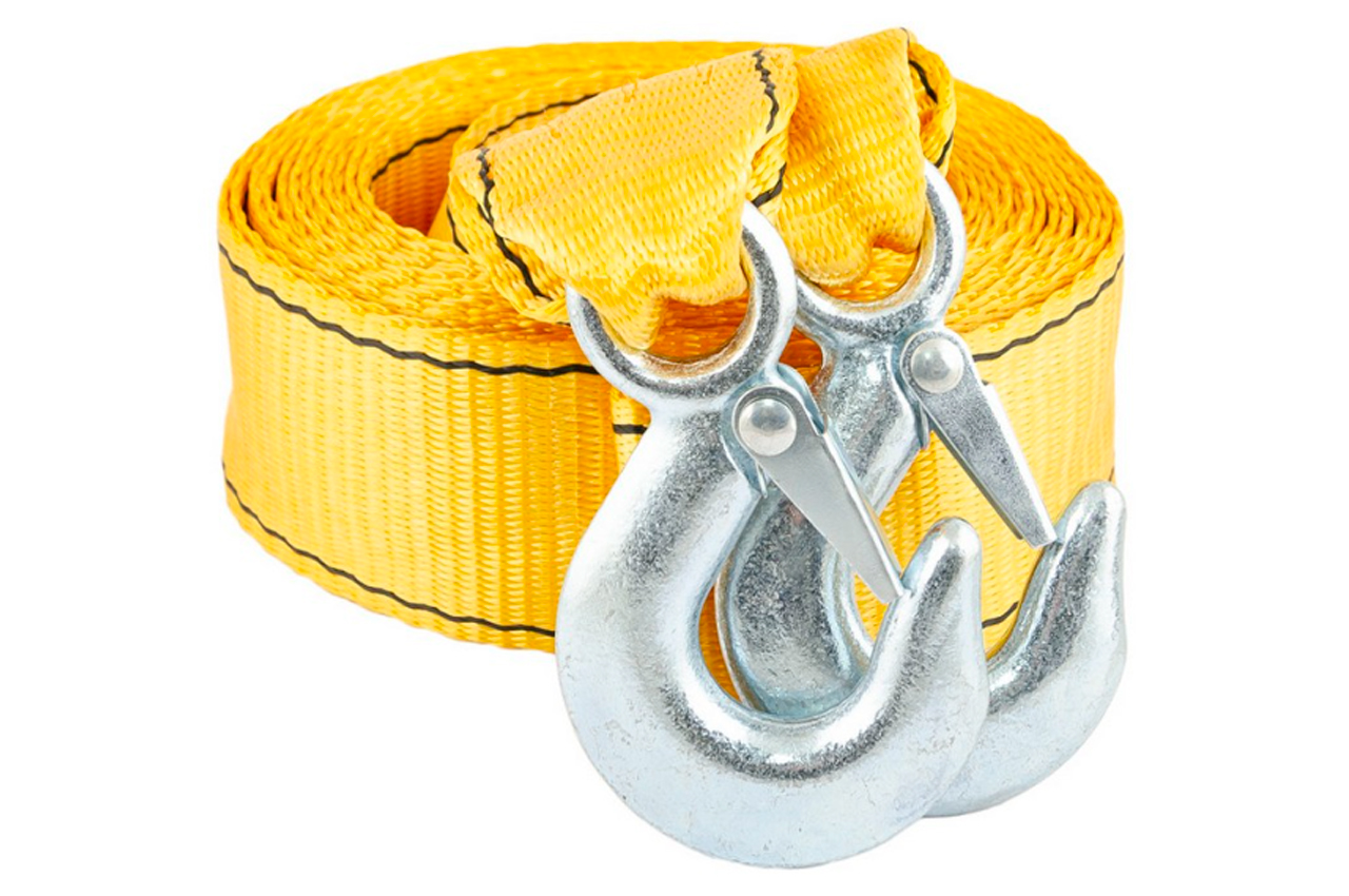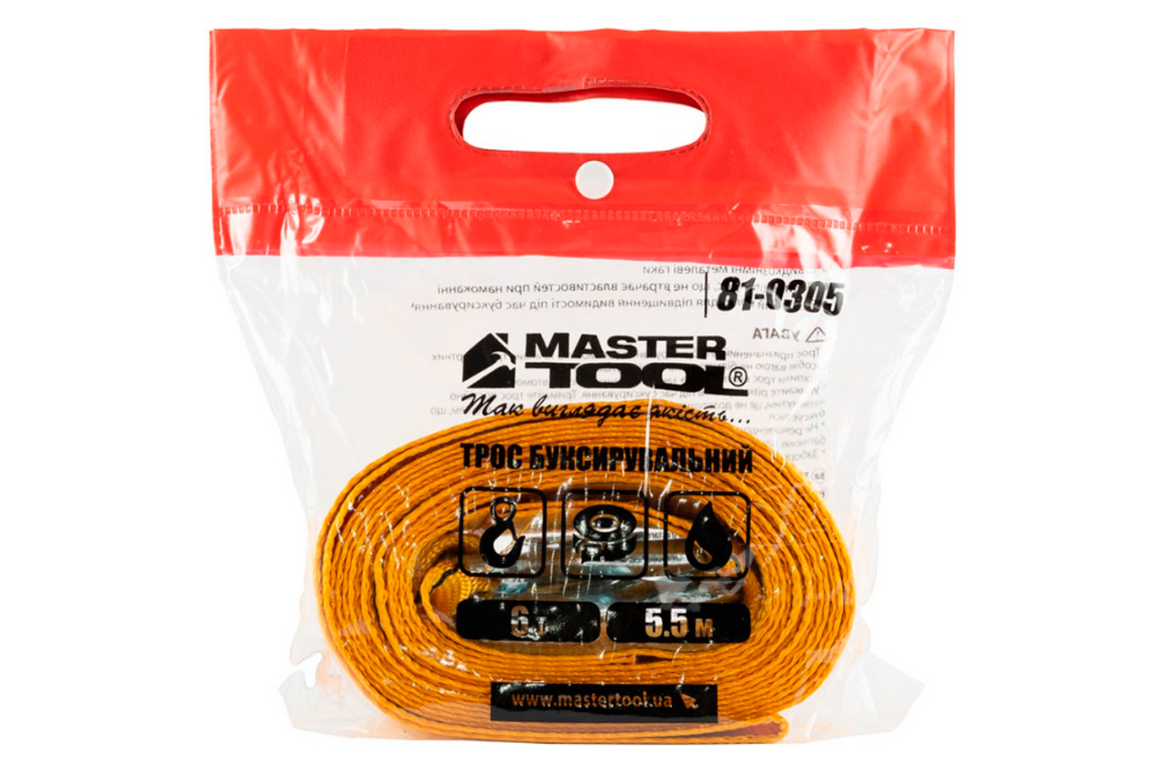 Трос буксировочный Mastertool – используется для буксировки транспортных средств. Нагрузка 6 т; Длина 5,5 м; Ширина: 60 мм.