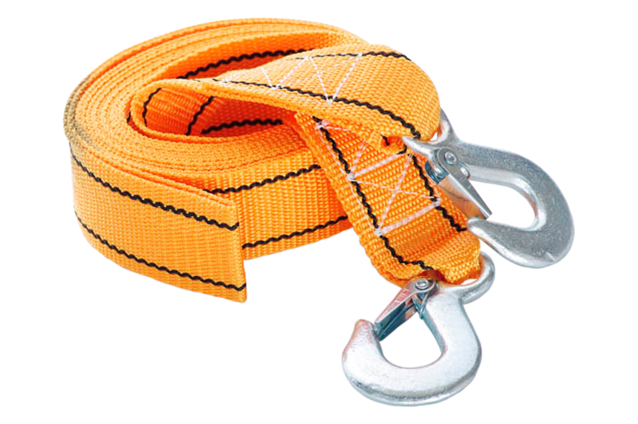 Трос буксировочный Сила – используется для буксировки транспортных средств. Максимальная нагрузка 3 т; Длина 4,5 м; Ширина: 50 мм. Материал полипропилен.