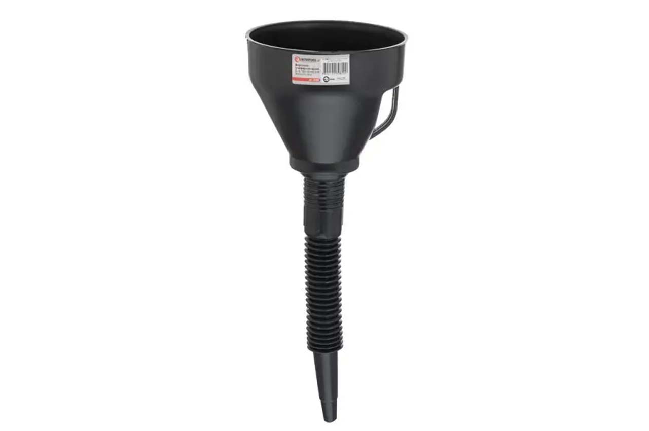 Универсальная воронка AT-3080 предназначена для заливки смазки, топлива и других технических жидкостей. Такая воронка понадобится не только автолюбителям, выполняющим работы с личным автомобилем в гараже, но и профессиональным мастерам, работающим в автосервисах или специализированных мастерских по ремонту разнообразной техники. Съемный гофрированный носик обеспечивает удобную заливку жидкостей даже в труднодоступные заливные горловины. В конструкции воронки предусмотрен фильтр грубой очистки, выполненный в виде сетки. Изготовлена лейка из устойчивого к химическим воздействиям пластика, поэтому с ней можно использовать бензин, дизельное топливо и другие технические жидкости.