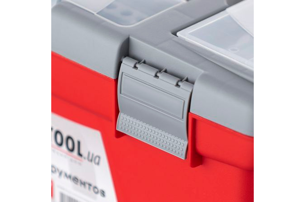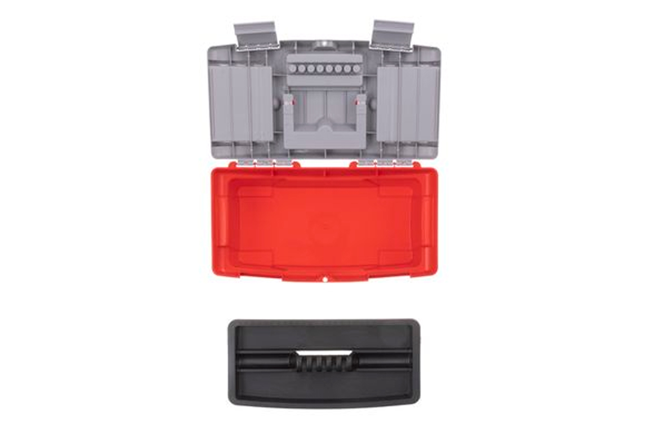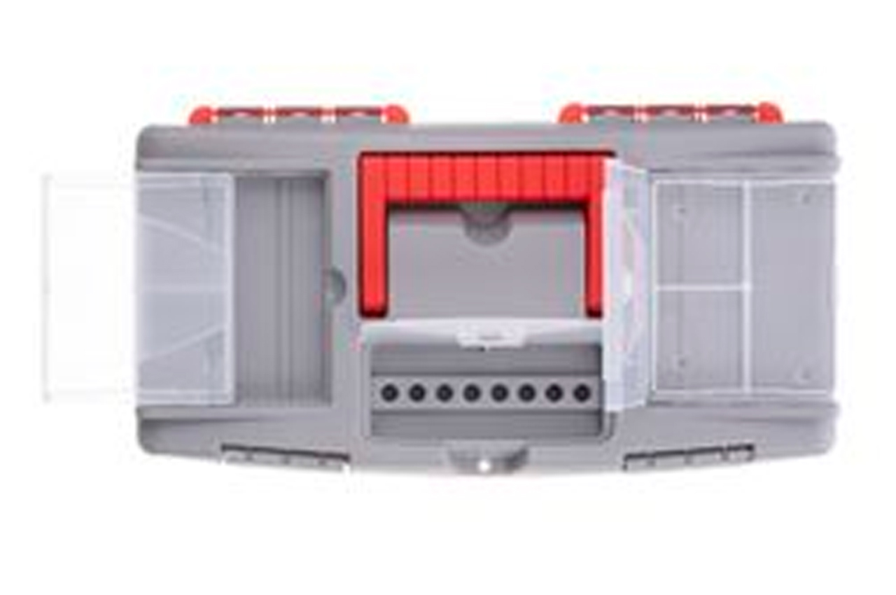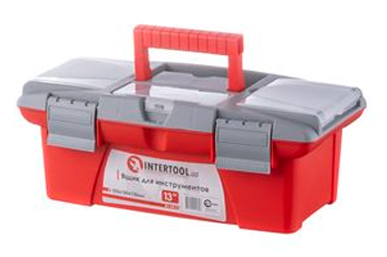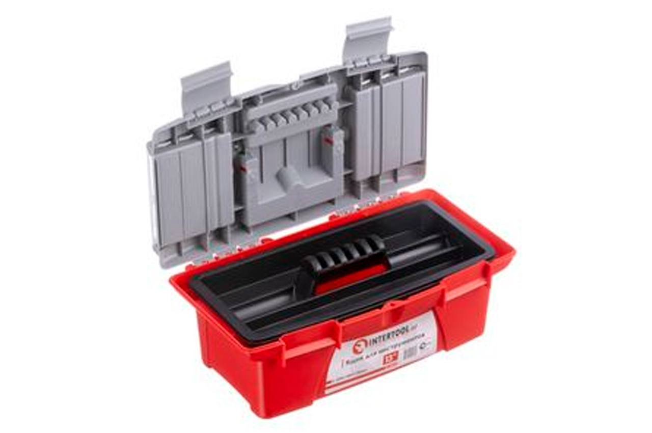 Ящик 13" изготовлен из прочного пластика, имеет прочную ручку для его ношения. Ящик имеет пластиковые замки и дополнительные пластиковые боксы на крышке. Два бокса - съемные, необходимы для хранения мелких деталей, расходных материалов и т.д. А третий бокс, расположенный на передней части крышке ящика имеет дополнительные отверстия для бит (отверточных насадок), головок. Габаритные размеры ящика - 335*185*130 мм.
