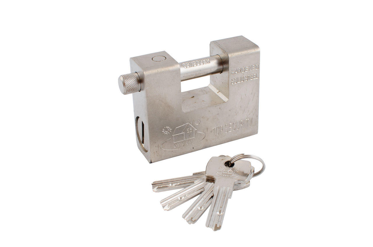 Замок навесной FZB изготовлен из хромированной стали, имеет П-образный литой корпус шириной 94 мм. В комплекте с замком три лазерных ключа.