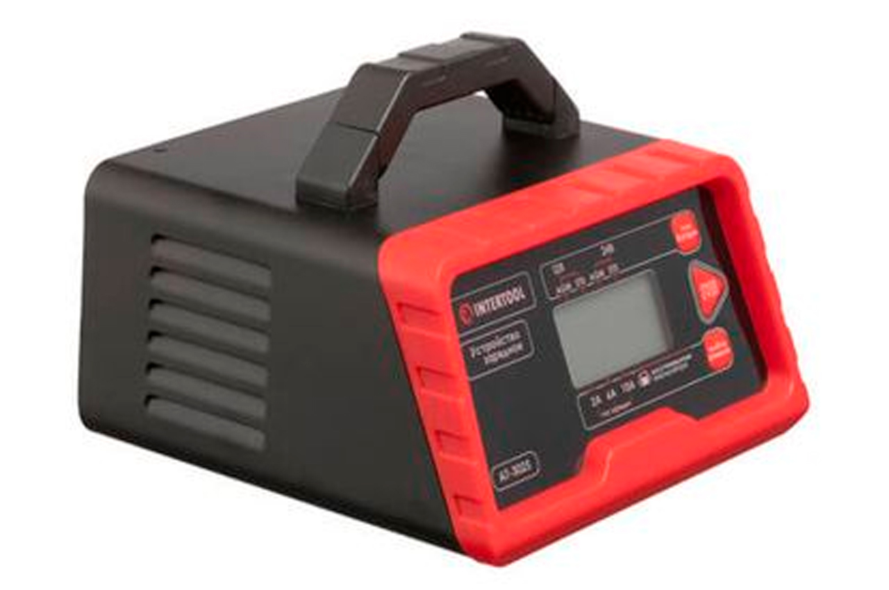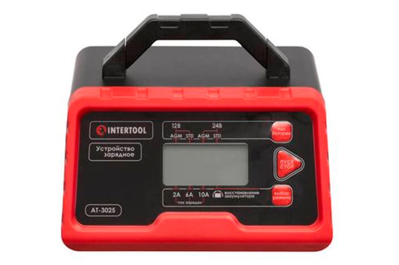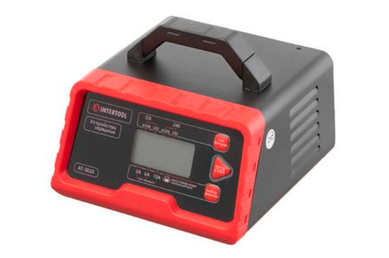 Зарядное устройство AT-3025 - интеллектуальное, управляется микропроцессором и системой с многоступенчатым циклом зарядки. Это зарядное устройство подходит для батарей: 12В и 24В, в том числе для аккумуляторов мотоциклов, квадроциклов, лодок, садовых тракторов, фургонов, автобусов, грузовиков и больших сельскохозяйственных машин. Особенности: Интеллектуальное зарядное устройство с микропроцессорным контроллером. Многоступенчатый цикл зарядки - 10 ступеней. Заряжает батареи различных типов: AGM, WET, MF, EFB, GEL. Режим восстановления возвращает емкость старым, давно разряженным батареям. Электронная защита против перегрева, короткого замыкания и неправильной полярности. Функция памяти режима - при внезапном отключении от сети, ЗУ запоминает режим и при включении начинает процесс на определенном этапе. Интеллектуальная система диагностики состояния и уровня заряда АКБ позволяет не только подобрать оптимальный режим зарядки, но и поддерживать батарею в состоянии полного заряда. Режим восстановления позволит восстановить емкость старой, полностью разрядившейся батареи. ЗУ в этом режиме очищает сульфат с пластин, тем самым продлевает жизнь вашему аккумулятору. LCD дисплей показывает состояние аккумулятора и зарядного устройства, а также результат восстановления. Устройство оснащено амперметром для удобного контроля тока зарядки. С помощью кнопок на корпусе, вы можете выбрать необходимой ток зарядки и напряжение аккумулятора. Электронная защита от перегрузки, короткого замыкания и неверного подключения (обратная полярность) уберегут ваш аккумулятор и зарядку от повреждений и поломок. ЗУ также оснащено функцией температурной компенсации - датчик автоматически регулирует напряжение в зависимости от температуры окружающей среды. На корпусе размещается удобная ручка для транспортировки. Зарядное устройство имеет полностью изолированные клеммы.