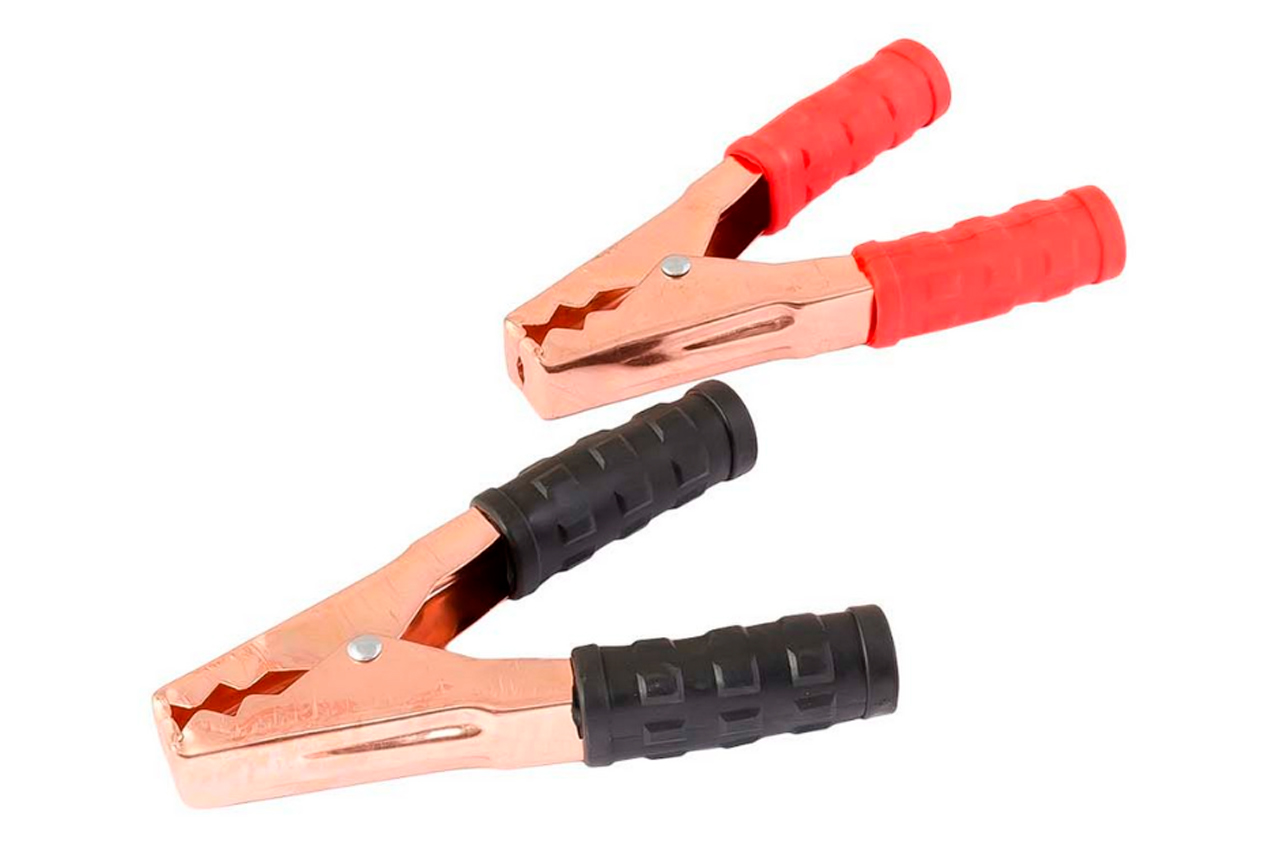 В наборе 2 зажима. Зажимы для клемм аккумулятора изготовлены из алюминия сверху покрытого медью, длина - 14 см, расстояние между ручками – 9 см, обрезиненные ручки красного и чёрного цвета. Красный подключается к положительной клемме АКБ, а чёрный - к отрицательной.
