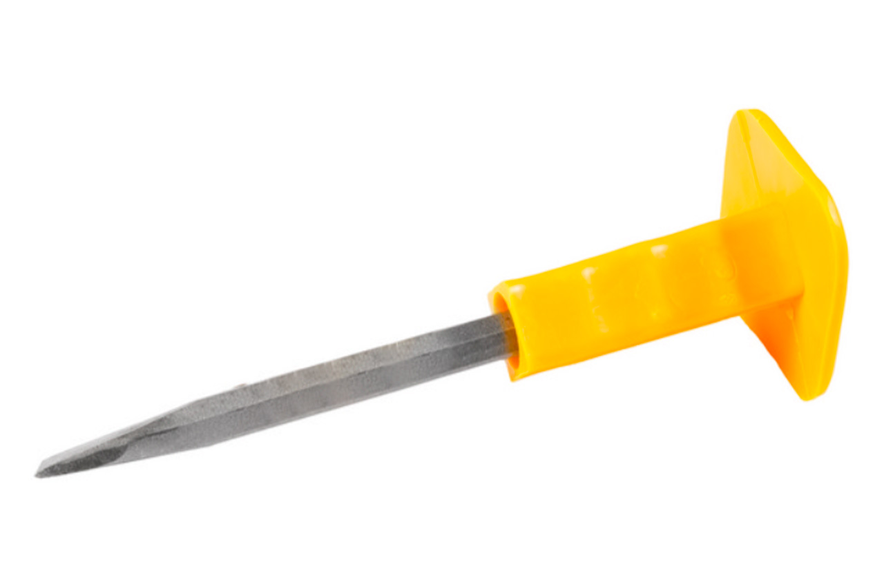 Предназначен для рубки металла и обработки камня. Оснащен эргономичной рукояткой с пластмассовым фартуком для защиты рук от удара. Имеет углубления для пальцев, обеспечивающие более комфортную и удобную работу.