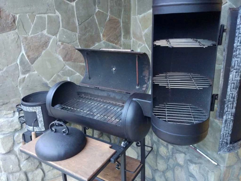 Це практичний варіант для тих, хто хоче поєднати мангал і коптильню. У бочці зрізають верх, приварюють кришку на петлях, додають ніжки та пази під шампури. Такий пристрій відрізняється стійкістю та функціональністю.