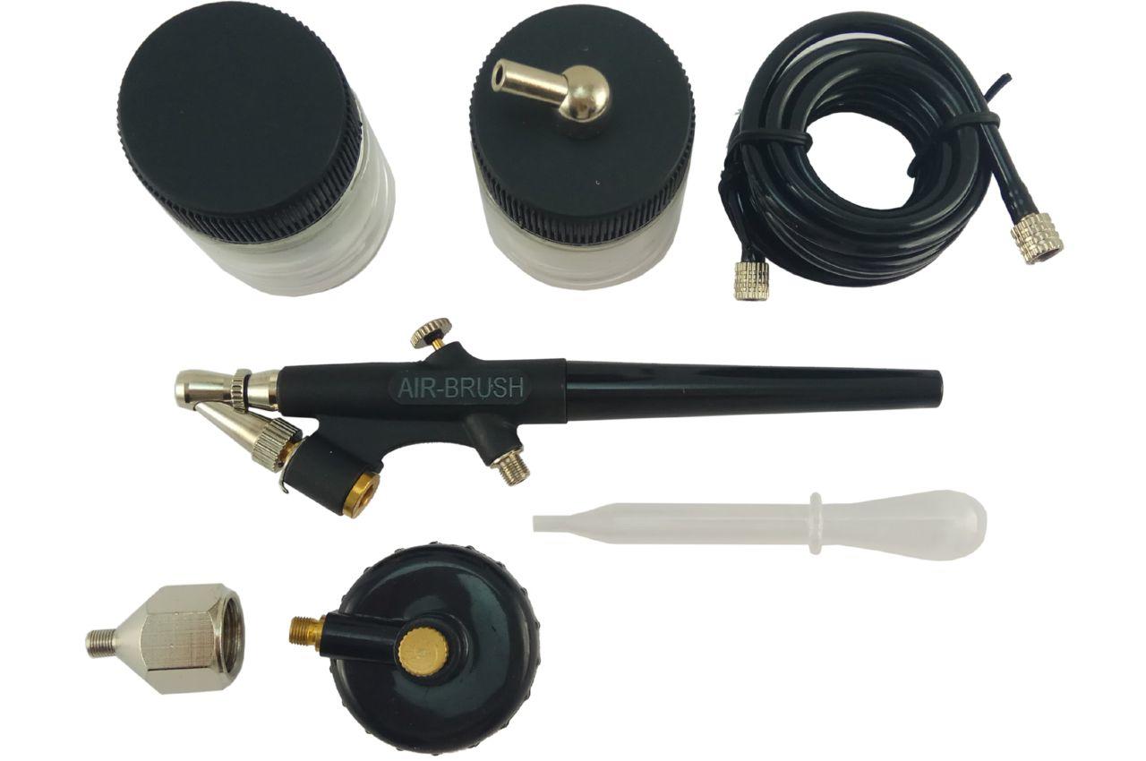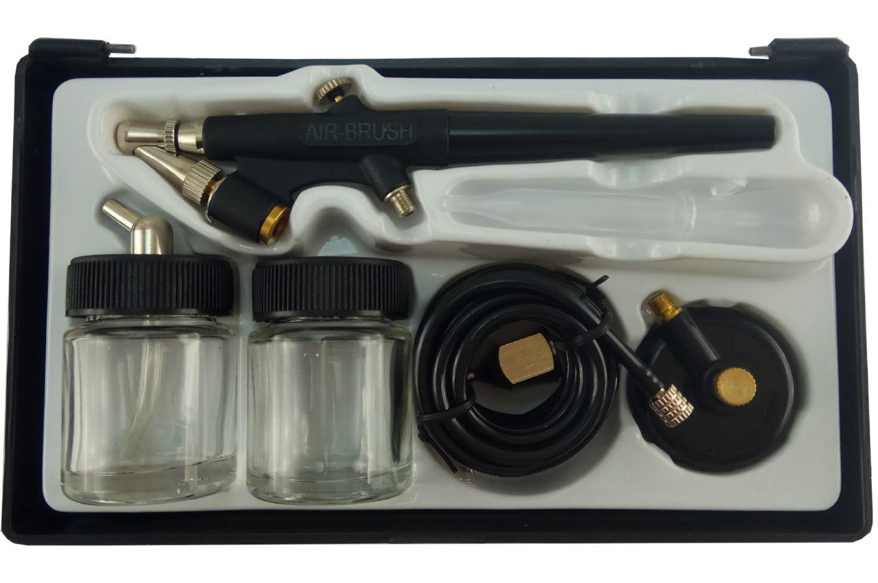 Міні аерограф з набором аксесуарів. Кнопка одинарної дії. Регулятор подачі ЛФМ. 2 пластикових бачка V = 22 мл. Пластиковий корпус. Повітряний шланг L = 1,5 м.