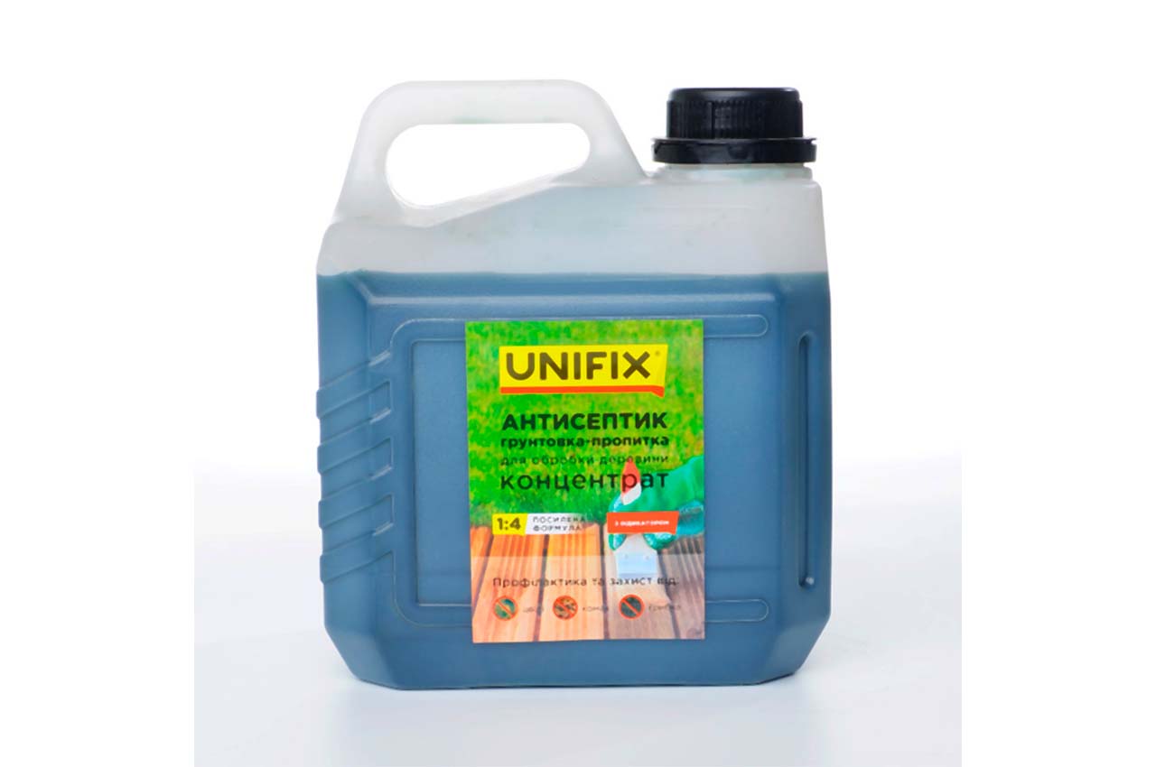 Антисептик ґрунтовка-просочення для обробки деревини Unifix - 3кг x 1:4 концентрат призначений для профілактики та знищення цвілі, грибка, комах на дерев'яних поверхнях. Може застосовуватися як перед фарбуванням, так і без неї.