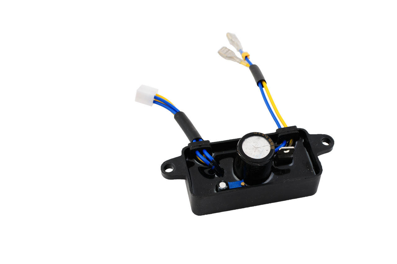 AVR автоматичний регулятор напруги генератора 220 В 2 кВт пластик, прямокутний. Блок контролює напругу на виході і силу струму в обмотці ротора. Напруга силової обмотки статора вимірюється і порівнюється з базовим значенням напруги, яке встановлено в блоці регулятора напруги.