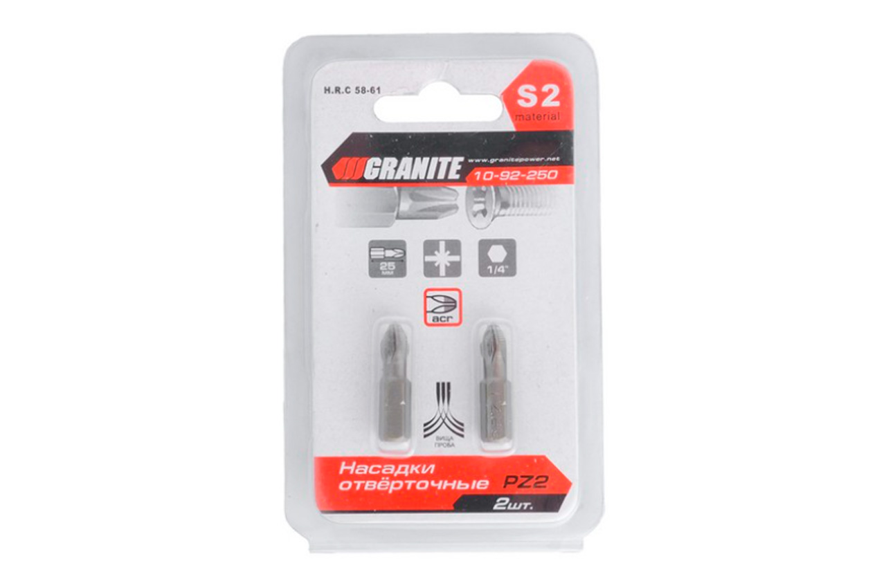 Біта Granite призначаються для використання як змінні насадки в ручному та механізованому інструменті. • сталь S2 • насічки ACR попереджають прослизання • хвостовик 1/4"