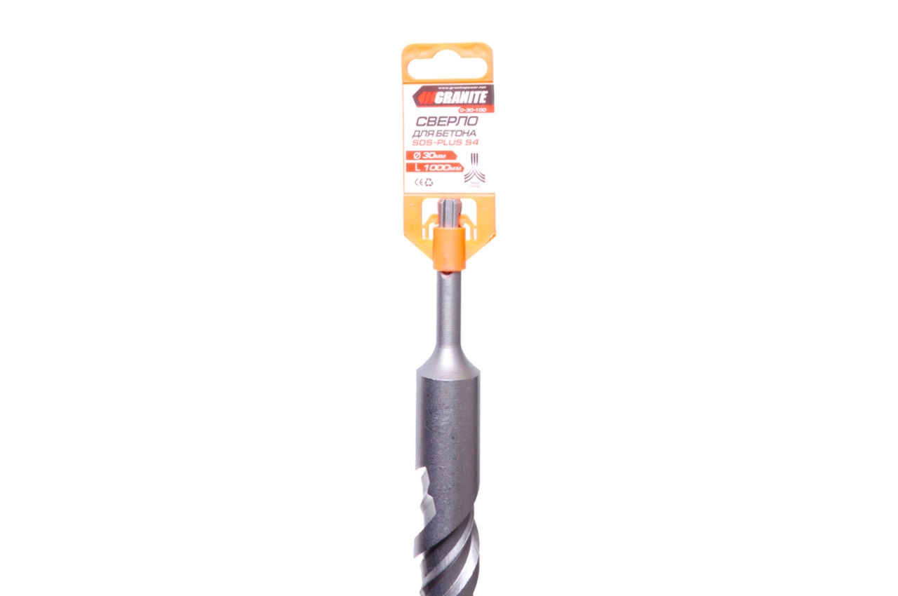 Бур по бетону "Granite" з твердосплавної побідитовою напайкою. Використовується для утворення наскрізного або глухого отвору у суцільному матеріалі та/або збільшення діаметра наявного отвору. Застосовується для обробки цегляної кладки, залізобетону, граніту і твердого бетону. Хвостовик SDS+; Діаметр свердління - 30 мм; Довжина бура - 1000 мм.