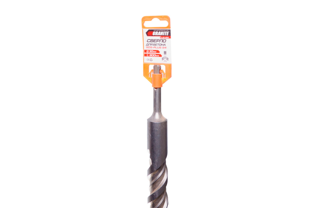 Бур по бетону "Granite" з твердосплавної побідитовою напайкою. Використовується для утворення наскрізного або глухого отвору у суцільному матеріалі та/або збільшення діаметра наявного отвору. Застосовується для обробки цегляної кладки, залізобетону, граніту і твердого бетону. Хвостовик SDS+; Діаметр свердління - 30 мм; Довжина бура - 800 мм.