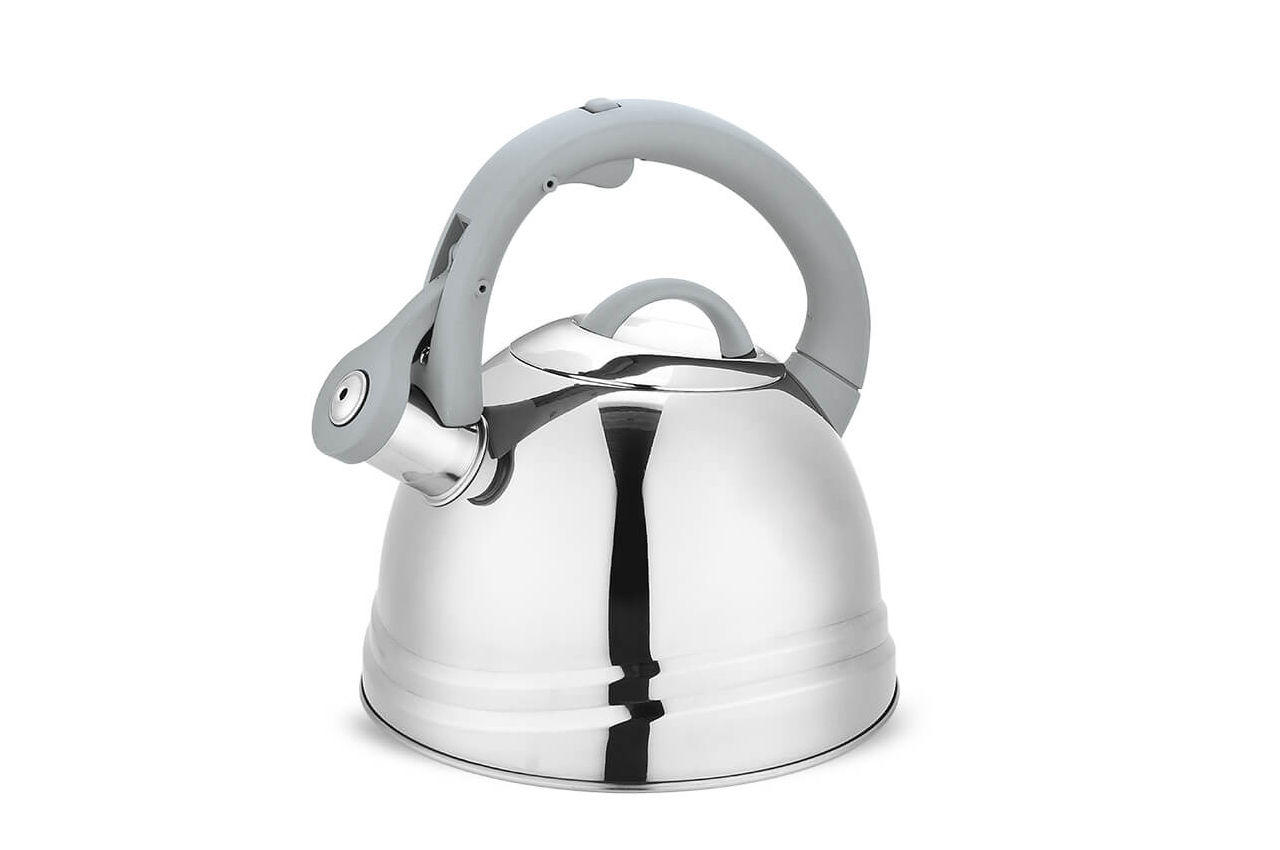 Чайник об'ємом в 2,5 л виготовлений з високоякісної нержавіючої сталі з глянсовою поліруванням. Оснащений клапаном-свистком і важелем для безпечного відкривання / закривання. Одношарове індукційне дно.Кришка чайника сталева з бакелітовій ручкою. Підходить для всіх типів плит, включаючи індукційні.