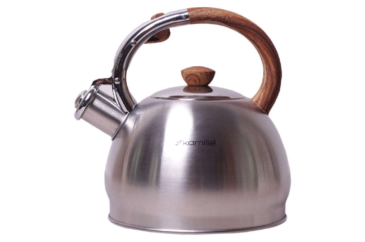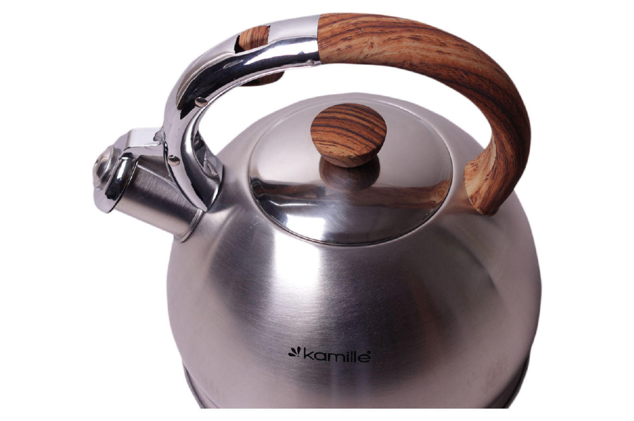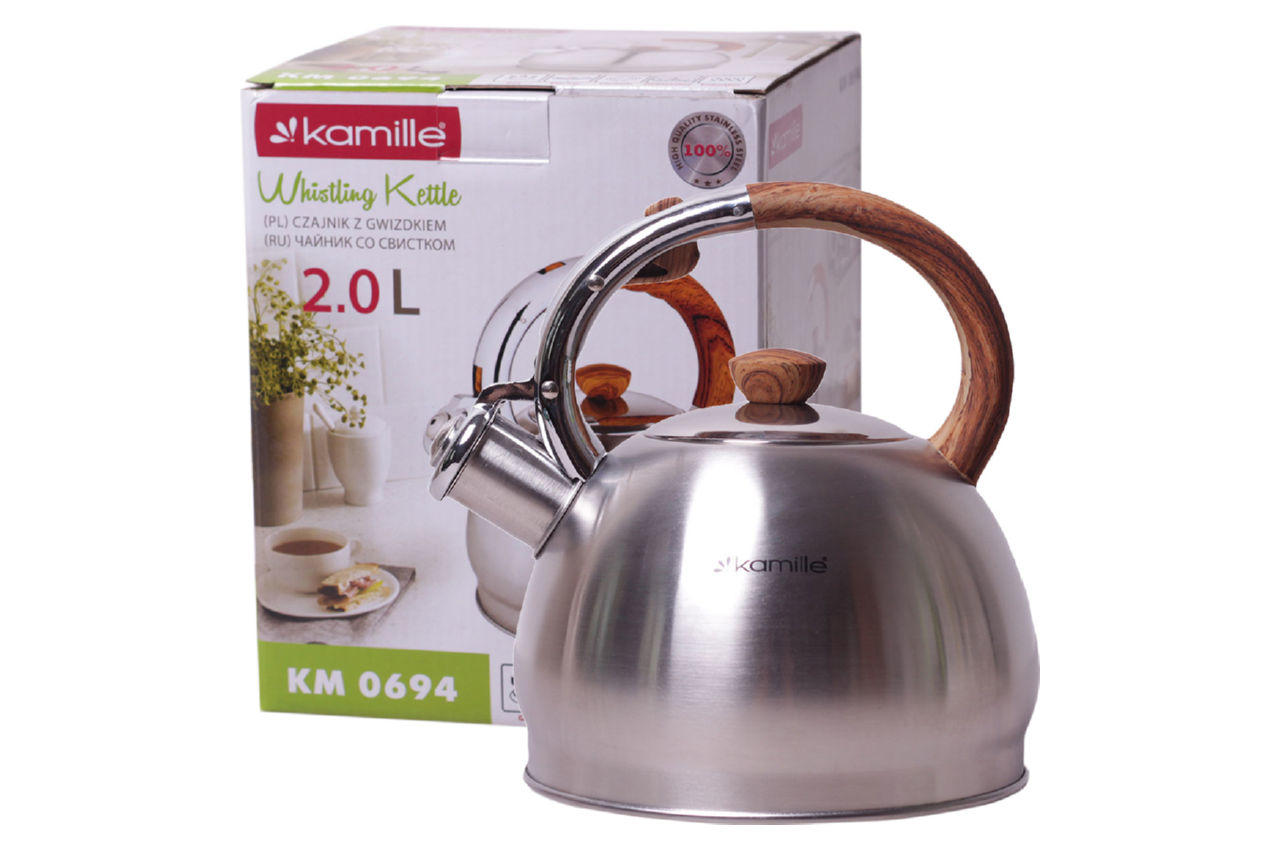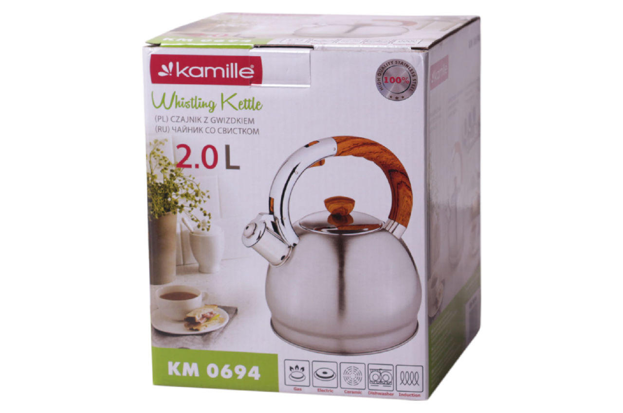 Чайник Kamille виготовлені з високоякісних матеріалів з використанням новітніх технологій виробництва, завдяки чому вони підходять для інтенсивного щоденного використання, а їх естетичний зовнішній вигляд неодмінно підійде до дизайну Вашої кухні. Матеріал: нержавіюча сталь Матеріал кришки: нержавіюча сталь Тип ручки: фіксована Загальний об'єм: 2л Колір ручки: коричневий (під дерево)