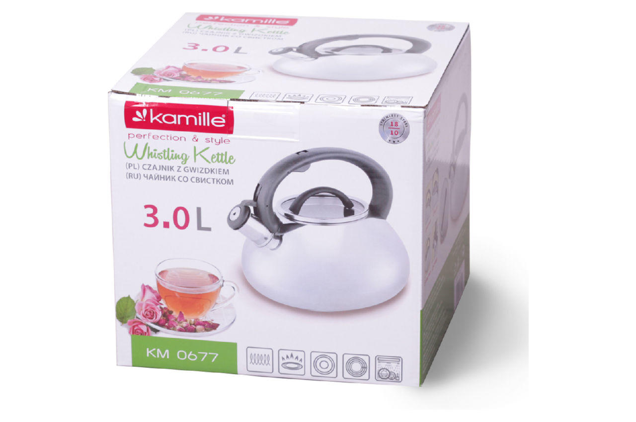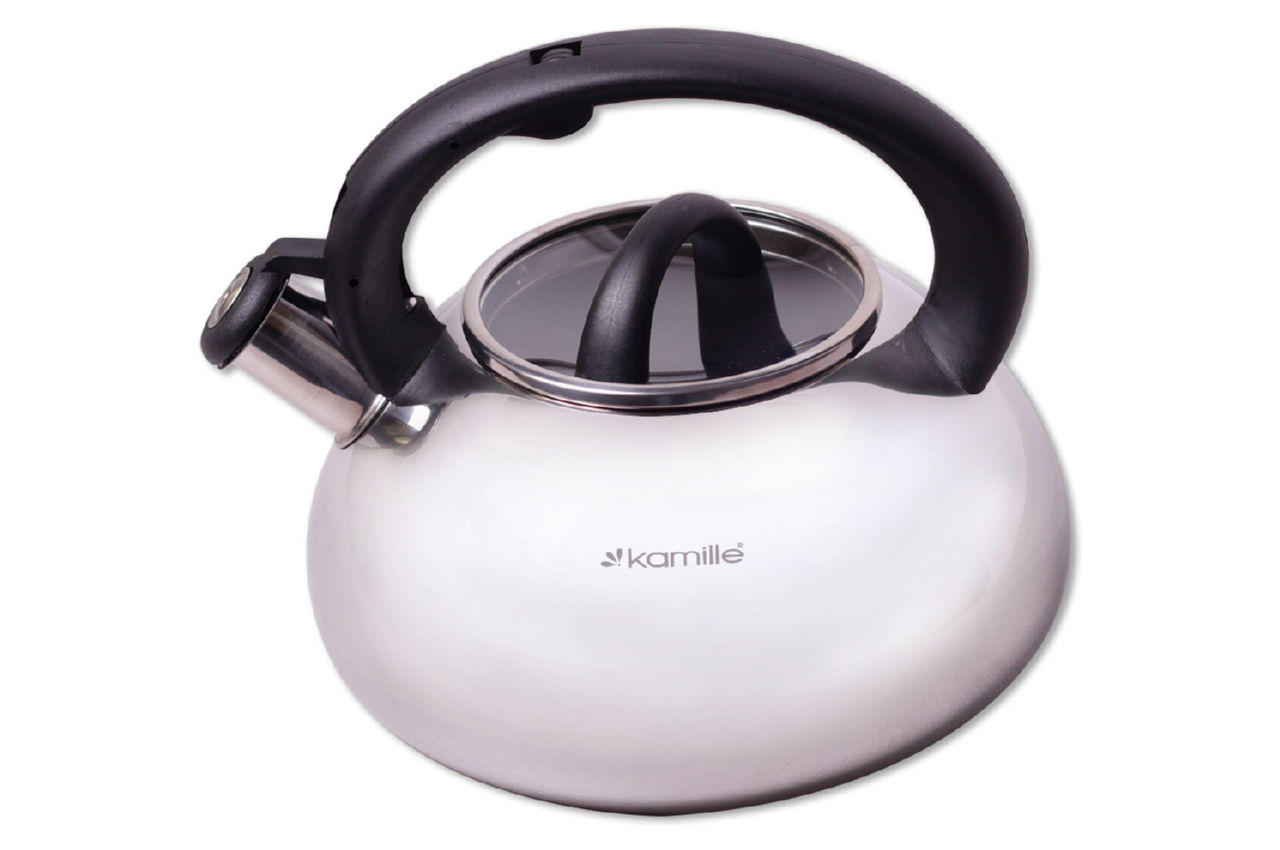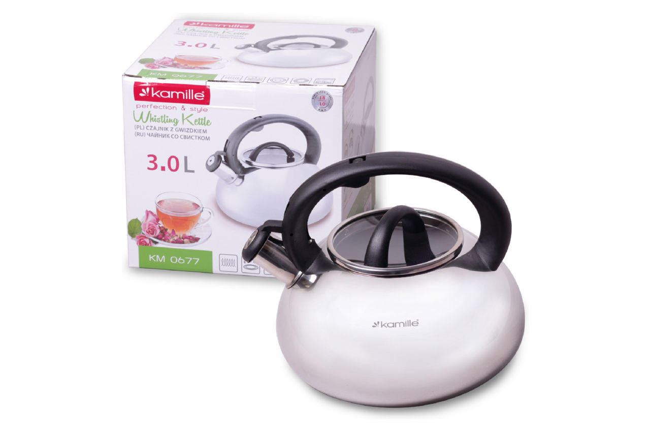 Чайники Kamille виготовлені з високоякісних матеріалів з використанням новітніх технологій виробництва, завдяки чому вони підходять для інтенсивного щоденного використання, а їх естетичний зовнішній вигляд неодмінно підійде до дизайну Вашої кухні. Матеріал: нержавіюча сталь Матеріал кришки: жаростійке скло Матеріал ручки: бакеліт Тип ручки: фіксована Загальний об'єм: 3 л