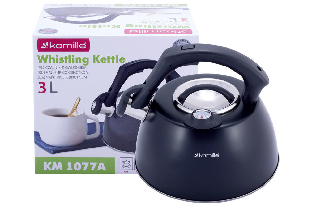 Чайники Kamille виготовлені з високоякісних матеріалів з використанням новітніх технологій виробництва, завдяки чому вони підходять для інтенсивного щоденного використання, а їх естетичний зовнішній вигляд неодмінно підійде до дизайну Вашої кухні. Матеріал: нержавіюча сталь. Загальний об'єм: 3л. Обробка металу: дзеркальна. Колір ручки: чорний. Матеріал кришки: нержавіюча сталь. Матеріал ручки: нейлон. Є термометр. Діаметр дна (зовні): 22см. Висота (з ручкою): 20,5 см
