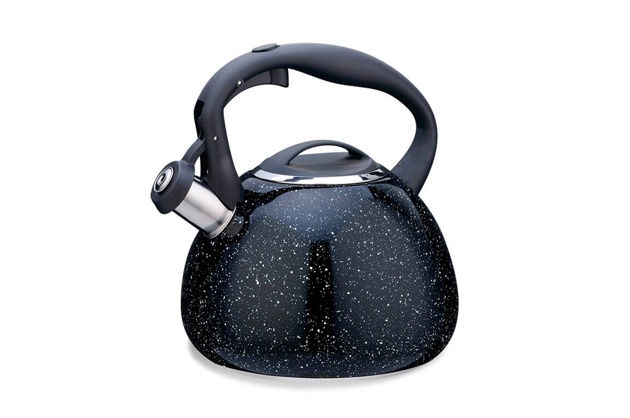 Чайник об'ємом в 2,5 л виготовлений з високоякісної нержавіючої сталі з глянсовою поліруванням. Оснащений клапаном-свистком і важелем для безпечного відкривання / закривання.