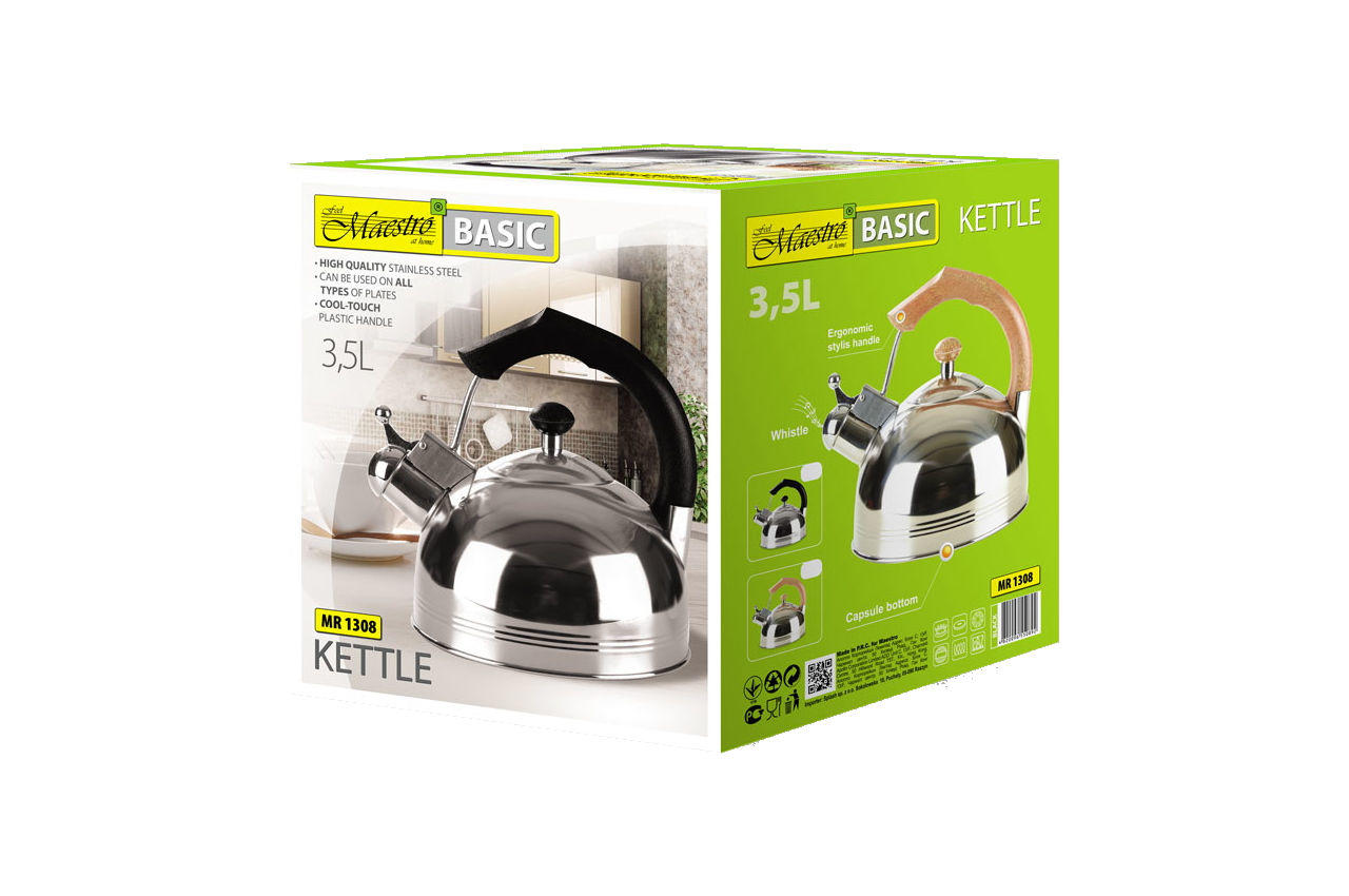 Чайник нержавіючий Maestro – 3,5 л чорний. Чайник виготовлений з високоякісної сталі – який не тільки не проіржавіє, а й найголовніше – не шкодитиме вам. Завдяки зручній ручці та матеріалу – бакеліт, з якого вона виготовлена, вам не загрожує отримати опік. Чайник оснащений спеціальним свистком, який повідомляє вам, що вода закипіла. Є спеціальний важіль, за допомогою якого легко та просто можна відкривати та закривати свисток. Цей чайник підходить для всіх типів плит, крім індукції. Об'єм складає 3,5л, найбільш оптимальний для сім'ї.