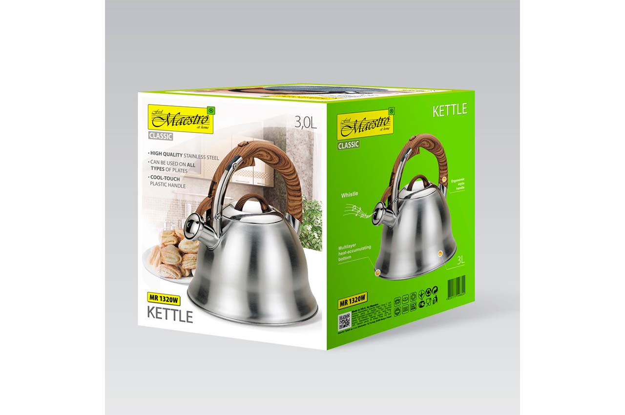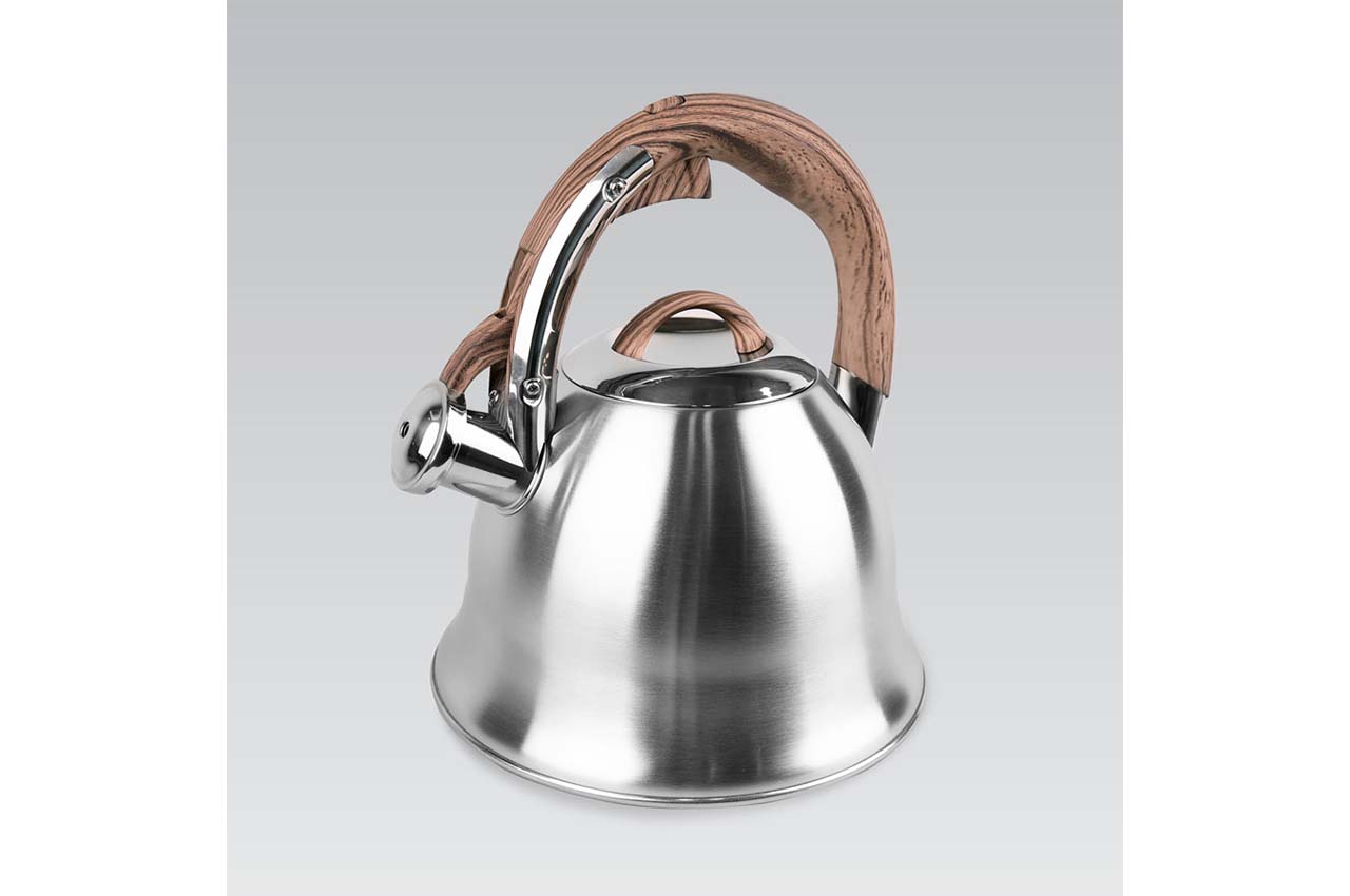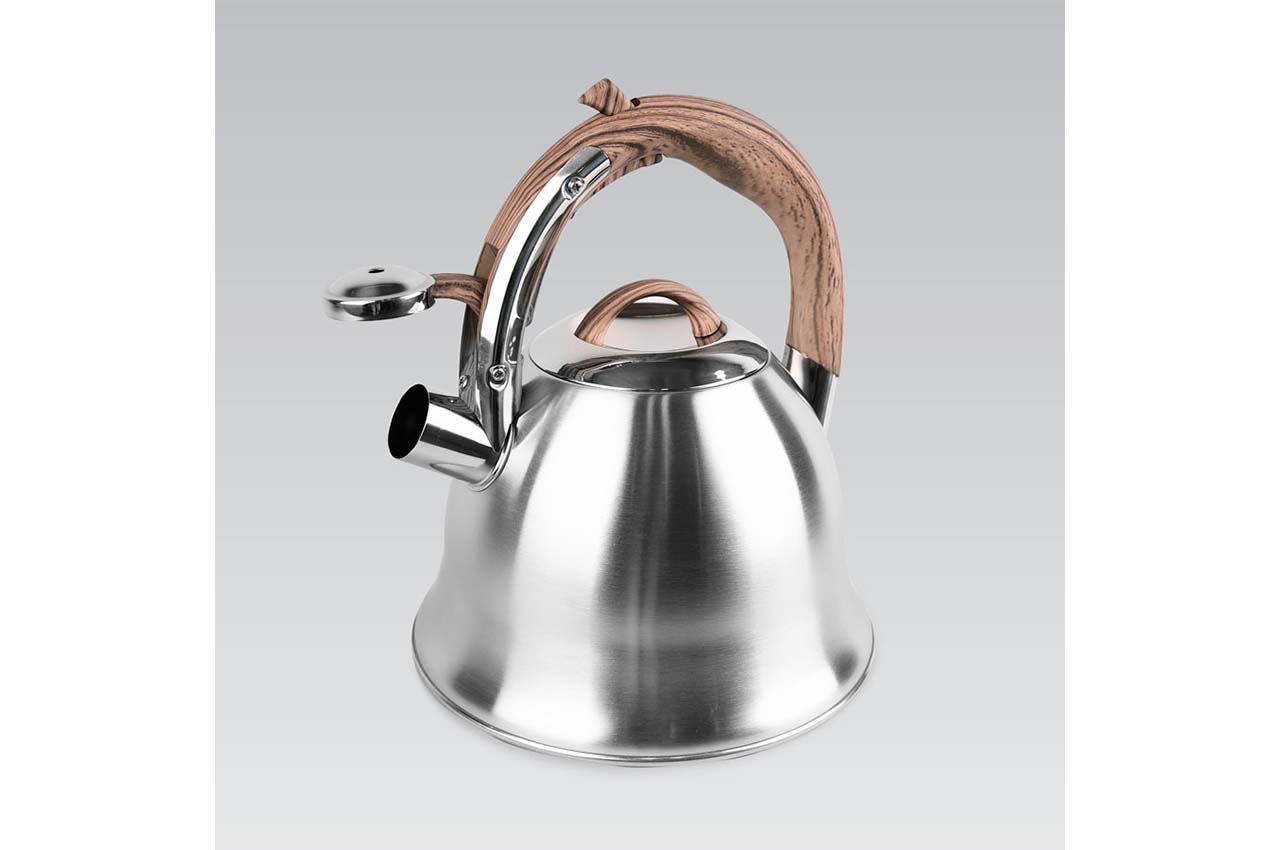Чайник нержавіючий Maestro - 3л виготовлений з високоякісної нержавіючої сталі з глянсовою поліруванням. Оснащений клапаном-свистком і важелем для безпечного відкривання / закривання. Одношарове індукційне дно.Кришка чайника сталева з бакелітовій ручкою. Підходить для всіх типів плит, включаючи індукційні.