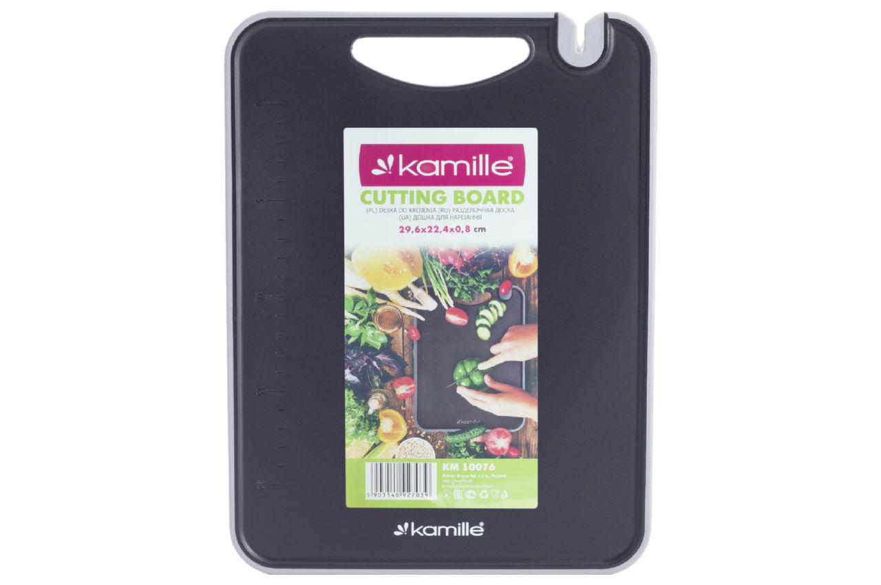 Дошка обробна Kamille - це надійний та практичний інструмент для кухні, який стане незамінним помічником під час приготування їжі. Розміри дошки — 296 мм в довжину, 224 мм в ширину та 8 мм у товщину, що дозволяє комфортно працювати з великими шматками м'яса, овочами або фруктами. Легко чиститься та має високу стійкість до пошкоджень, забезпечуючи тривалий термін служби.