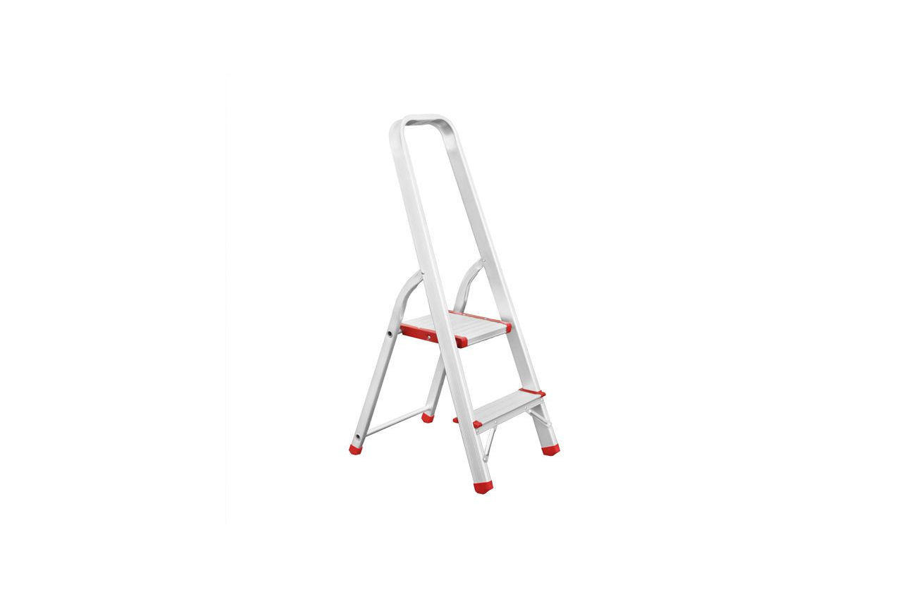 Драбина алюмінієва виготовлена з міцного алюмінієвого профілю. Легко розкладається і складається, має 2 нескользящие рифлені щаблі й майданчик, а також зручний поручень. Висота до платформи - 410 мм, витримує навантаження до 150 кг, важить 2,7 кг. Оснащена пластиковими наконечниками на ніжки, що запобігають ковзанню і дряпання поверхні. Профіль: алюмінієвий прямокутний; Кількість ступенів: 2 од .; Висота до платформи: 410 мм; Максимальне навантаження: 150 кг
