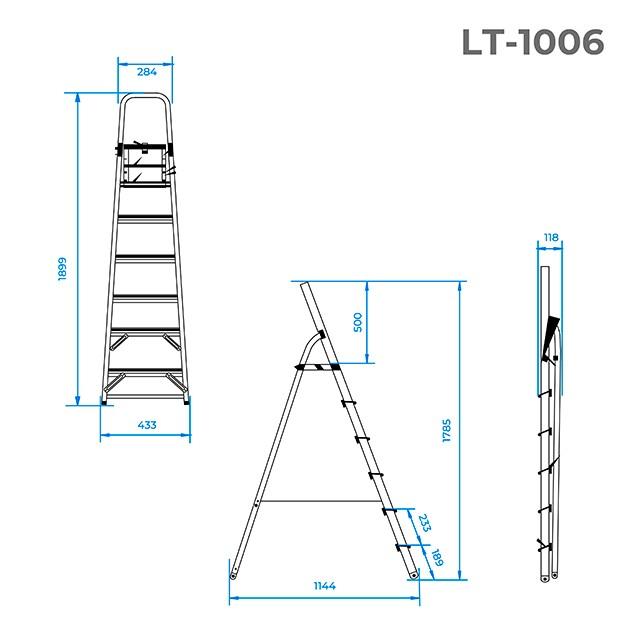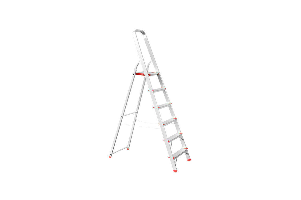 Драбина алюмінієва виготовлена з міцного алюмінієвого профілю. Легко розкладається і складається, має 6 нековзних рифлених щаблів і майданчик, зручний поручень. Висота до платформи - 1280 мм, витримує навантаження до 150 кг, важить 5 кг. Оснащена пластиковими наконечниками на ніжки, що запобігають ковзанню і дряпання поверхні. Профіль: алюмінієвий прямокутний; Кількість ступенів: 6 од .; Висота до платформи: 1280 мм; Максимальне навантаження: 150 кг
