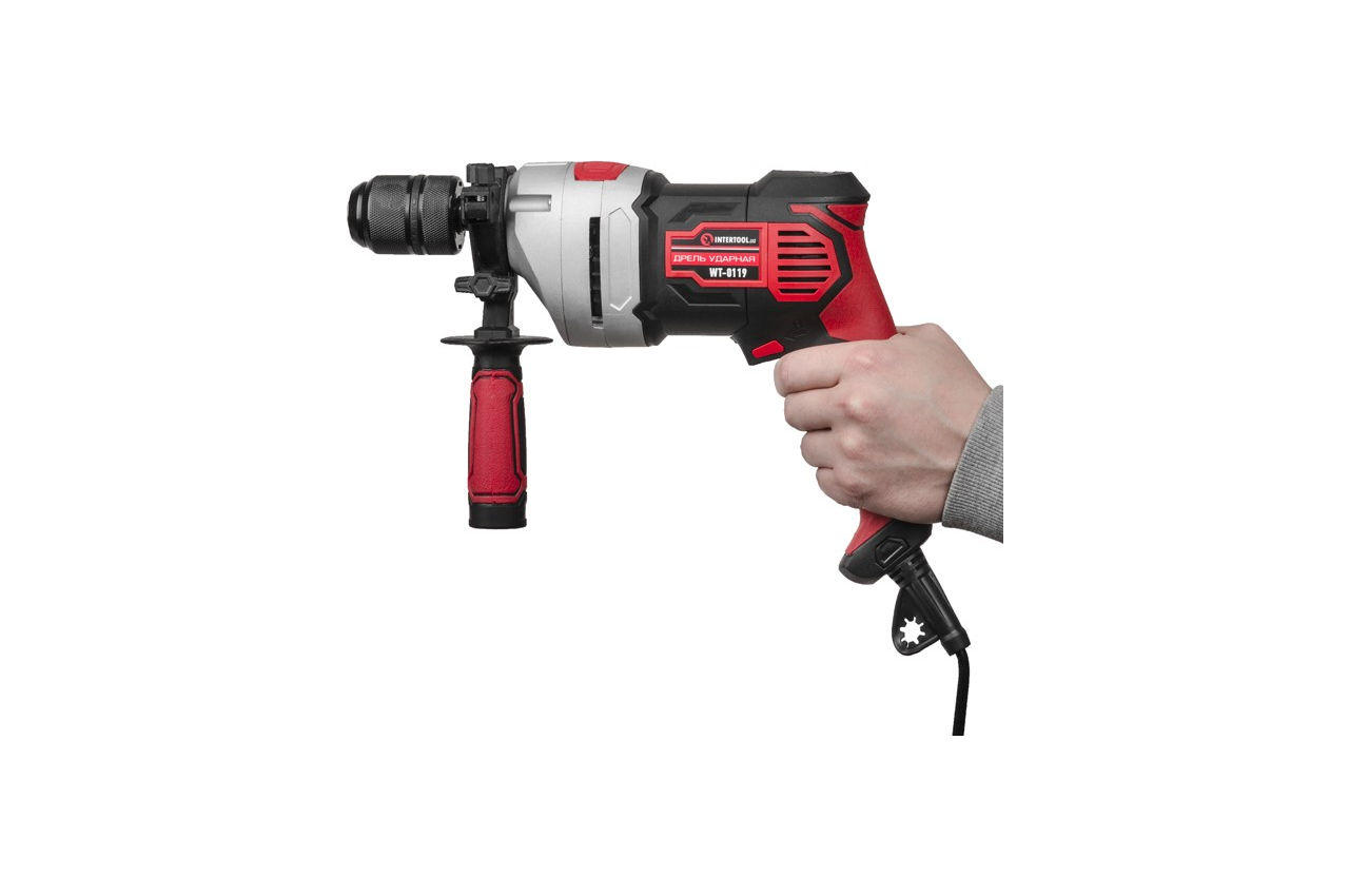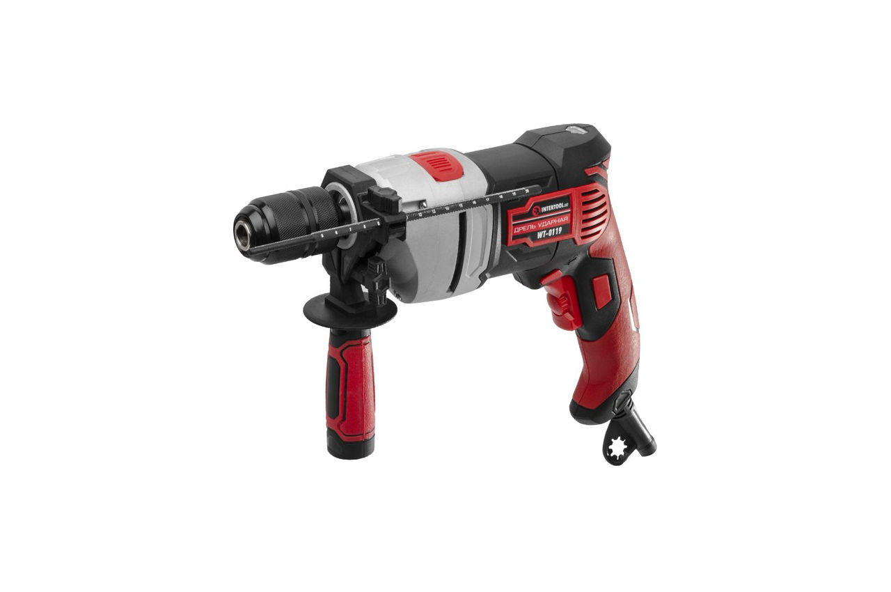 Ударний дриль - один з найпопулярніших інструментів дому та на будівельному майданчику, за рахунок об'єднання функцій класичної дрилі і побутового перфоратора. Ударний дриль WT-0119 призначена для максимально точного і чистого свердління отворів в бетоні, цеглі, металі, пластику і деревині. Невелика вага і розмір дозволяють зберігати і перевозити дриль без особливих проблем. Особливості Велика кількість оборотів (до 2800 об / хв) і висока частота ударів (до 44800 уд / хв), допомагають робити рівні і точні отвори навіть у щільних матеріалах. Металевий корпус редуктора ефективно відводить тепло і збільшує тривалість роботи і термін служби інструменту. Заміна свердла займає лічені секунди, без використання ключа і великих фізичних зусиль. На дрилі встановлено швидкозажимний металевий патрон під хвостовики, діаметром 1.5-13 мм. Можливості дрилі розширені: регулятором і обмежувачем оборотів, кнопкою реверс, індикатором, двома режимами свердління (з ударом і без нього), фіксатором пускової кнопки, додатковою рукояткою і обмежувачем глибини свердління. Знижує навантаження на зап'ястя і зручно сидить в руках, завдяки якісній збірці, прогумованої рукоятці і відмінному розподілу ваги. Дриль, потужністю 900 Вт, легко справляється з поставленими завданнями. На дриль встановлений швидкозажимний металевий патрон, що значно економить час при частій заміні свердла. Він надійно фіксує хвостовики діаметром від 1.5 до 13 мм і не дає їм провертатися навіть в ударному режимі. Міцний металевий корпус редуктора збільшує робочий ресурс інструменту тому ефективно відводить тепло, а також витримує велику механічну навантаження. функції, розширюють можливості дрилі Свердлить гладко і не перевантажується на старті, завдяки двом чуйним регуляторам оборотів з широким діапазоном: механічним (колесо-регулятор на кнопці пуск) і електронним (обороти залежать від сили натискання на кнопку пуск). Зручний перемикач на верхній частині дрилі, дозволяє вибрати між ударним і ненаголошених режимом. Кнопка реверсу на корпусі, м'яко перемикає дриль в протилежне обертання, без втрати потужності. Наявність цієї функції допомагає діставати свердла з глибоких отворів, а так само викручувати шурупи і саморізи (при використанні в якості шуруповерта). Фіксатор пускової кнопки (фіксує тільки повністю натиснуту кнопку) дозволяє зафіксувати інструмент в безперервному працюючому стані. Виставивши обмежувач глибини на потрібне значення, Ви не просвердлите матеріал наскрізь і зможете швидко зробити кілька однакових отворів. Індикатор напруги, розташований на верхній частині корпусу, загоряється помаранчевим кольором коли інструмент підключений до електромережі. Рукоятка і шнур Якісна збірка і прогумовані елементи на корпусі збільшують комфорт роботи і зменшують вібрацію. Додаткова прогумована рукоятка з гвинтовими зажимами дозволяє працювати двома руками, а також фіксує обмежувач. Потужний, надійний, двометровий провід не дубєєт при низькій температурі і не переламується. Візьміть цю ударну дриль в руки, і Ви за кілька секунд просвердлите отвір в бетоні, цеглі або нержавіючої сталі. Швидкозатискний патрон: 1.5-13 мм; Число оборотів холостого ходу: 0-2800 об / хв; Частота мережі: 50 Гц; Напруга живлення: 230 В; Потужність: 900 Вт; Максимальний діаметр свердління: дерево: 40ммсталь: 13ммкірп