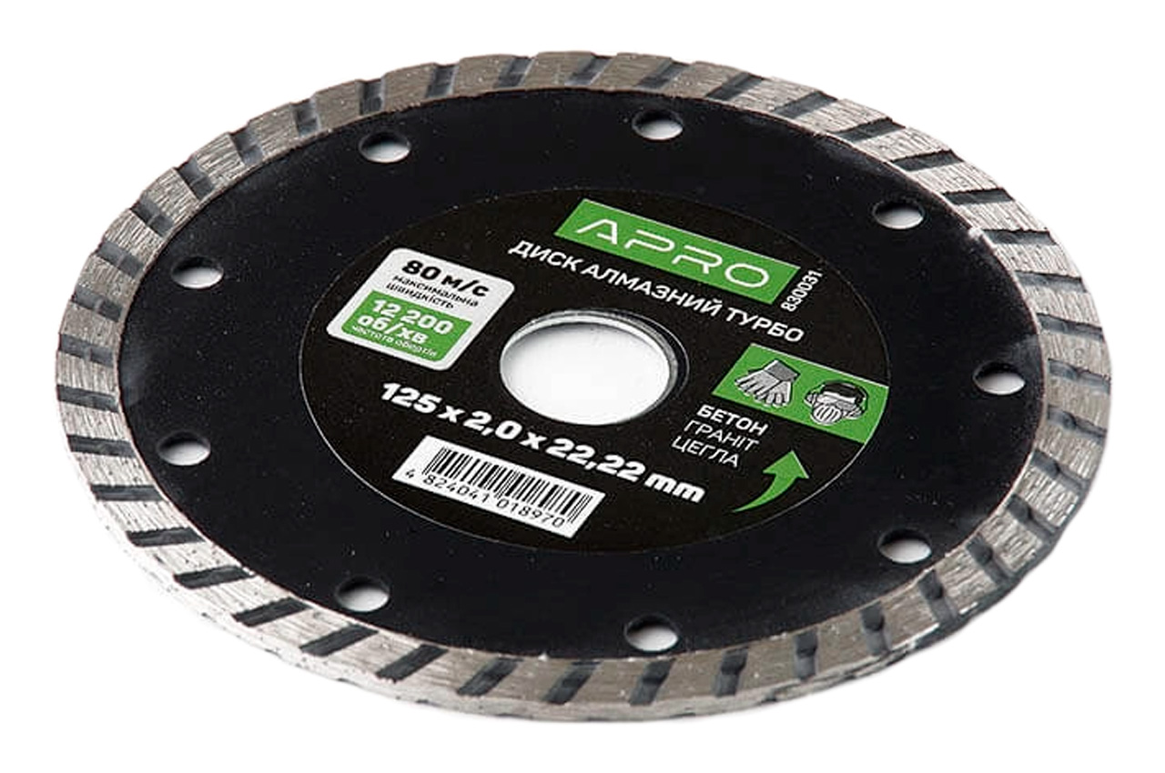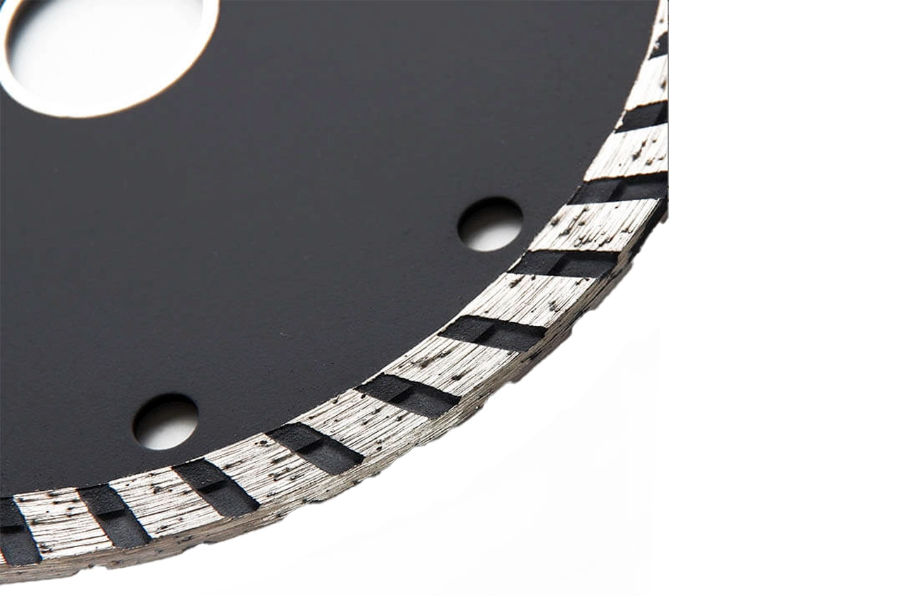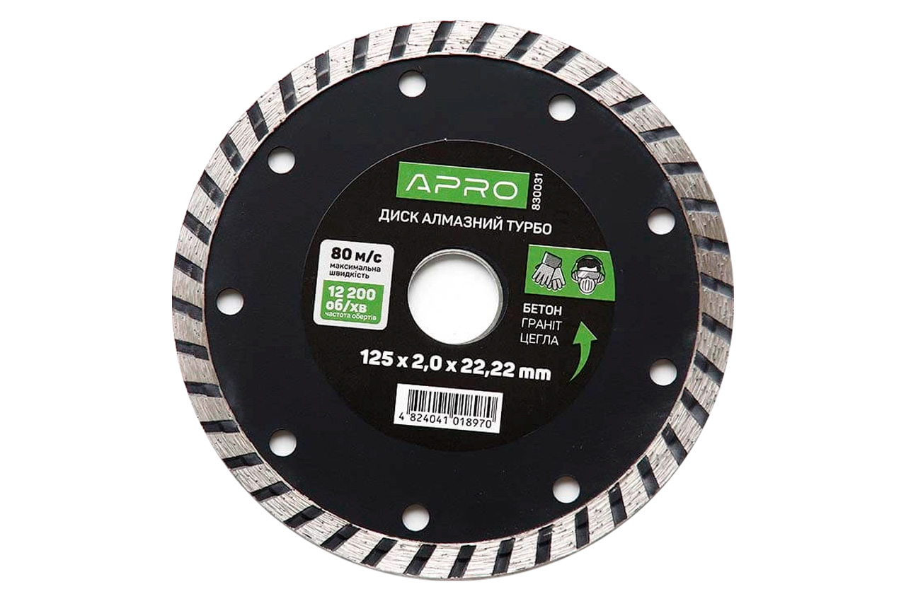 Алмазний диск 'TURBO' призначений для швидкого різання бетону, цегли, бруківки та каменю. Завдяки хвилястій формі ріжучого шару диск під час роботи краще охолоджується повітрям, тому його можна використовувати для сухого різу. Диски 'TURBO' найкраще підходять для робіт з бетоном. Діаметр диска 125 мм