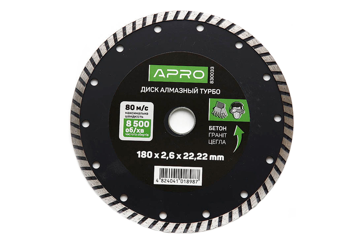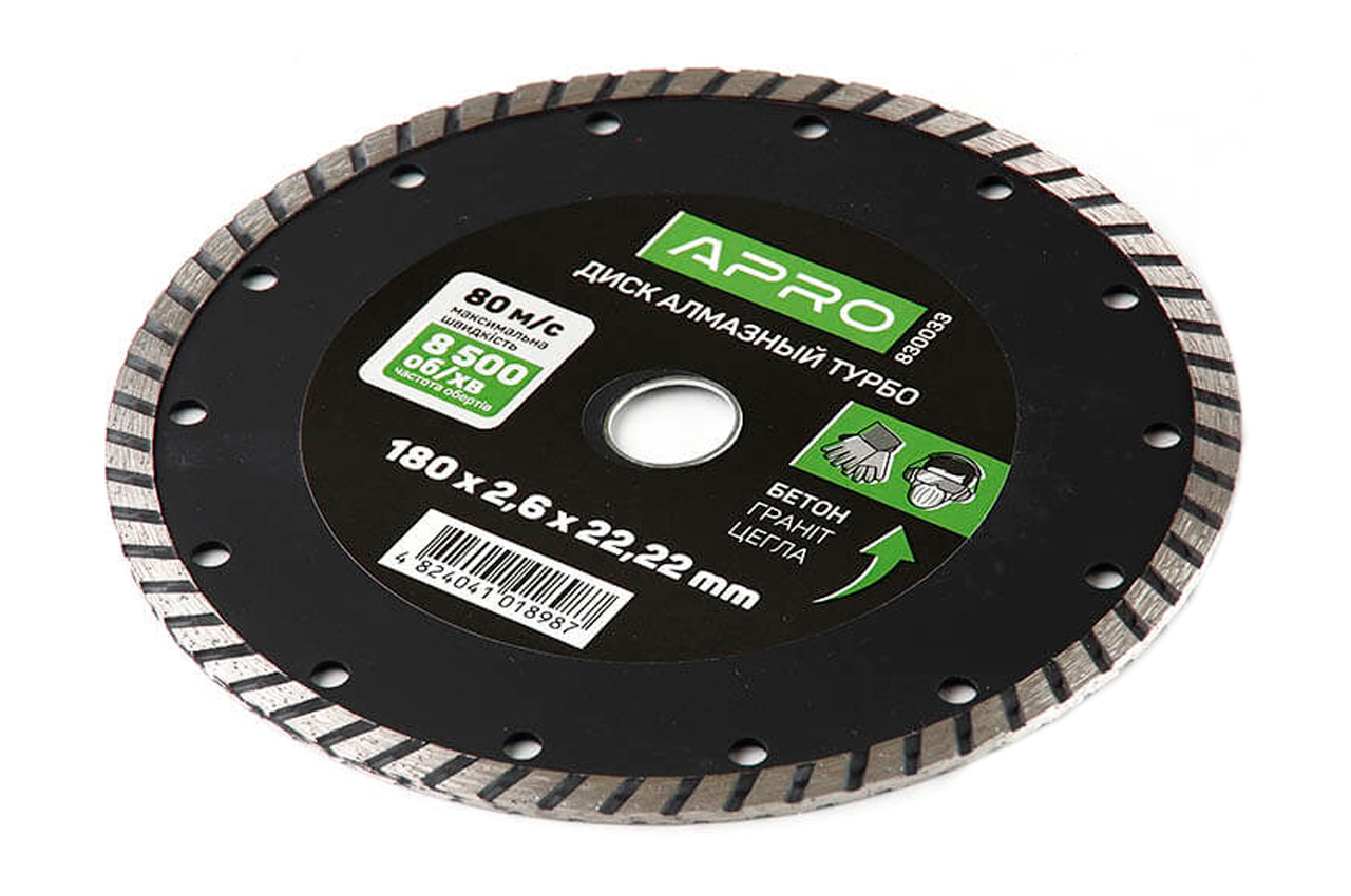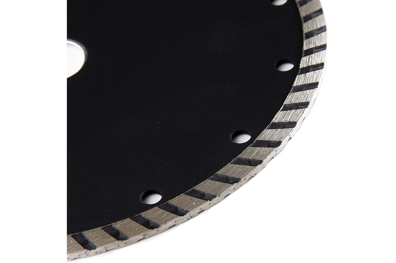 Алмазний диск 'TURBO' призначений для швидкого різання бетону, цегли, бруківки та каменю. Завдяки хвилястій формі ріжучого шару диск під час роботи краще охолоджується повітрям, тому його можна використовувати для сухого різу. Диски 'TURBO' найкраще підходять для робіт з бетоном. Діаметр диска 230 мм