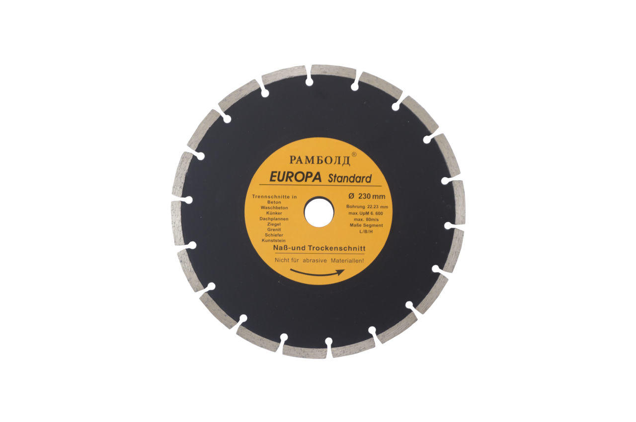 Алмазний диск "Рамболд" призначений для сухого різання будівельних матеріалів, таких як бетон, цегла, камінь, граніт, вогнетривкий матеріал. Використовується на УШМ, ручному електричного плиткоріз, штроборізи. Складається з алмазних сегментів і сталевого корпусу. Має унікальну функцію самозатачіванія. Діаметр диска 230 мм. Розмір отвору 22,2 мм.