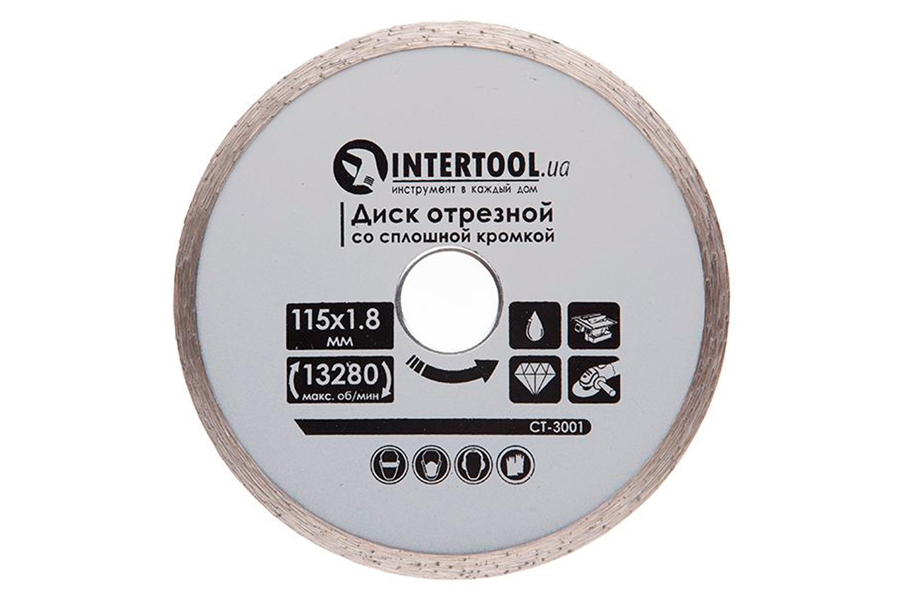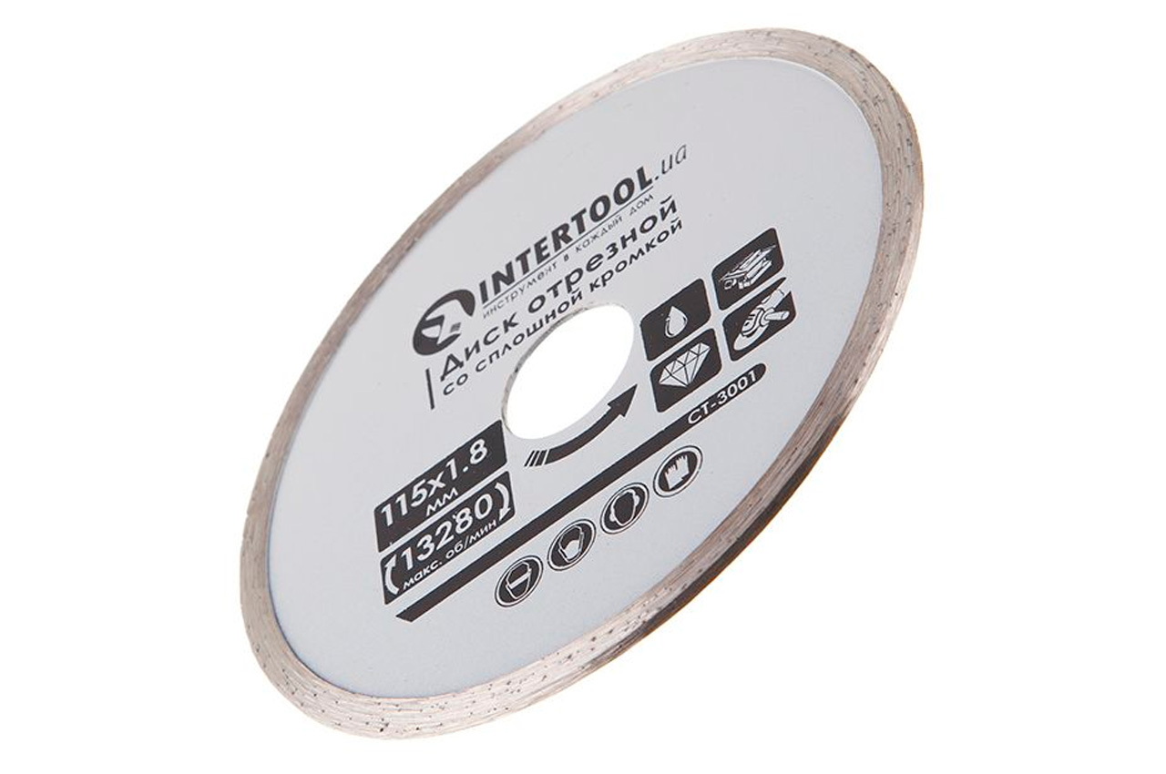 Алмазний диск відрізний "Intertool" із суцільною ріжучої крайкою призначений для акуратного різу тендітних матеріалів без сколів, що особливо важливо при різанні плитки, каменю, цегли або штучного каменю. Також важливим фактором є мінімізація або відсутність пилу при різанні. Склад металу самого диска дозволяє витримувати серйозну силове навантаження, проте необхідно використовувати мокрий тип різання. Насиченість діамантовою крихтою до 18%. Діаметр диска 115 мм. Розмір отвору 22.2 мм. Застосування: для плитки, каменю і цегли; Діаметр диска: 115 мм; Висота кромки: 5 мм; Ширина кромки: 1.8 мм; Насиченість діамантовою крихтою: 16-18%; Діаметр отвору: 22 мм