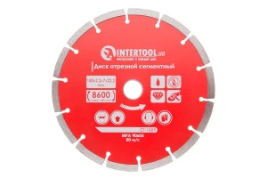 Алмазний диск "Intertool" призначений для різання твердих видів бетону, каменю та цегли. Ріжуча поверхня сегментних дисків розбита на секції, які збільшують швидкість різання і служать для відводу пилу. При цьому, тип різання можна використовувати як сухий, так і мокрий. Так само його можна використовувати для помірної різання граніту. Насиченість діамантовою крихтою складає 16-18%. Діаметр диска 180 мм. Розмір отвору 22.2 мм. Застосування: для цегли, каменю і бетону; Діаметр диска: 180 мм; Висота кромки: 7 мм; Ширина кромки: 2.2 мм; Насиченість діамантовою крихтою: 16-18%; Діаметр отвору: 22 мм
