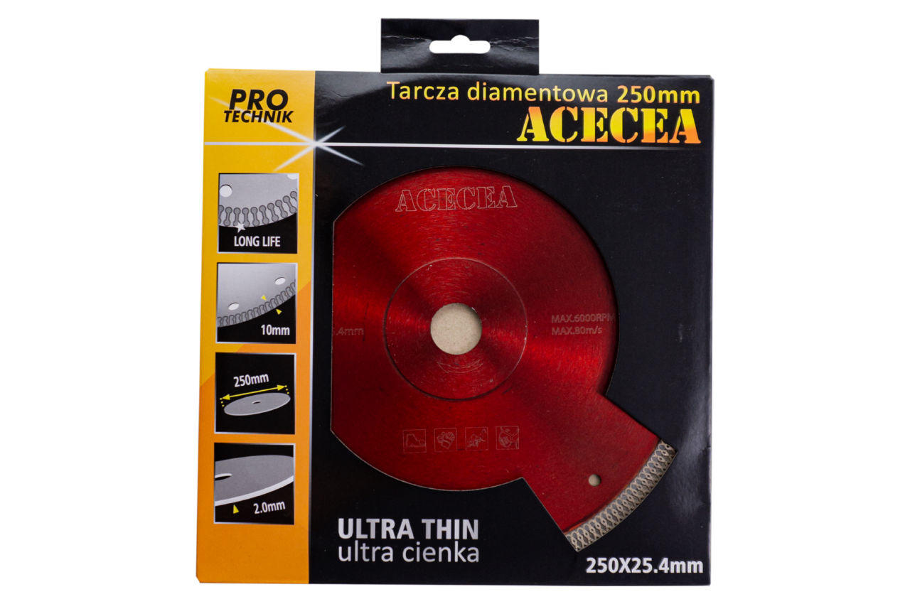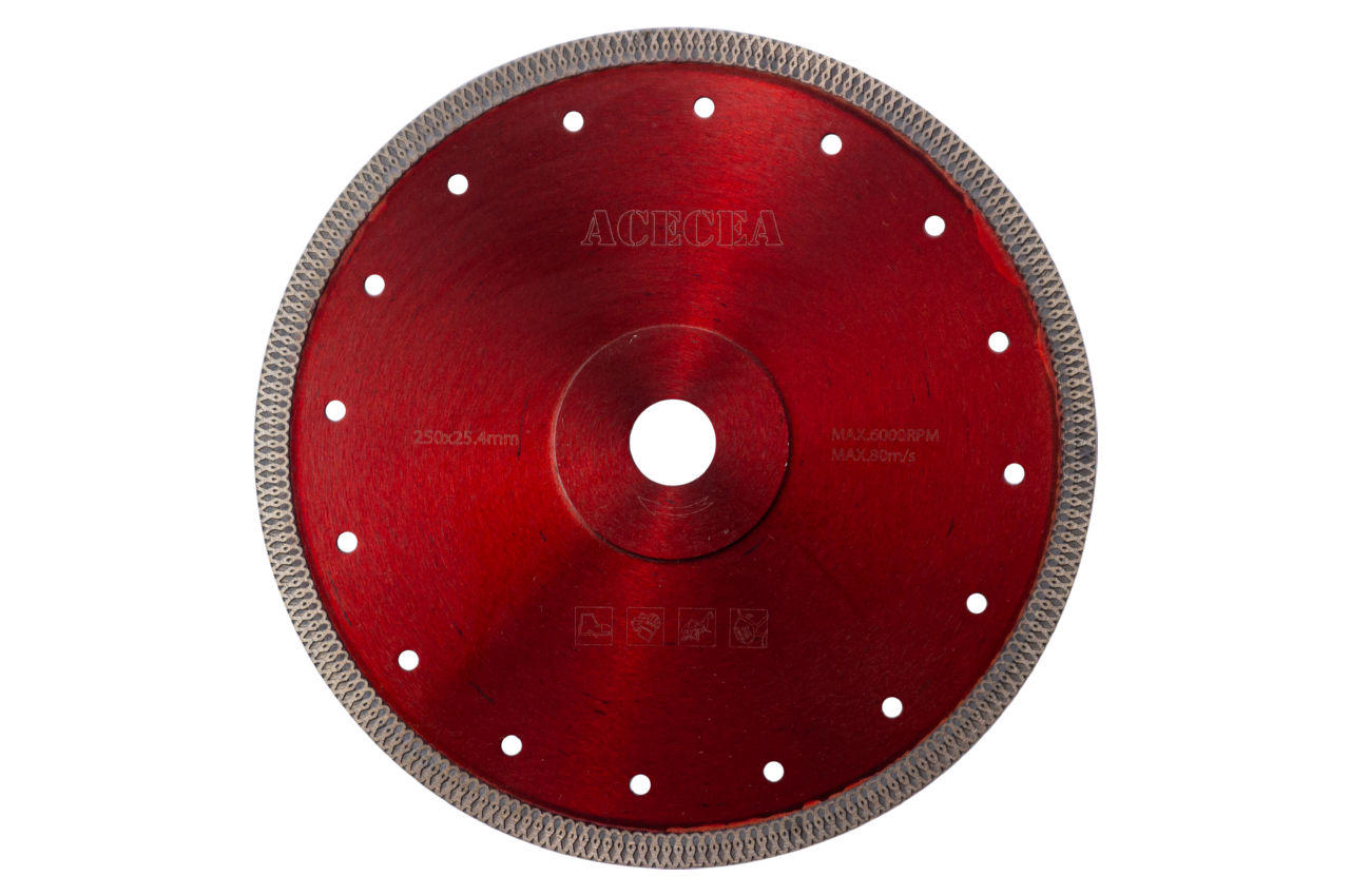 Алмазний диск має тонкість та чистий різ. Призначений для різання різних видів плитки, керамограніту, бетону, мармуру та граніту. Здатний різати керамограніт без води. Його особливостями є підвищена концентрація діамантового зерна. Діаметр диска 250 мм. Розмір отвору 25,4 мм.