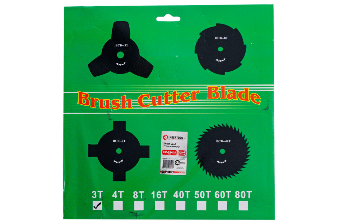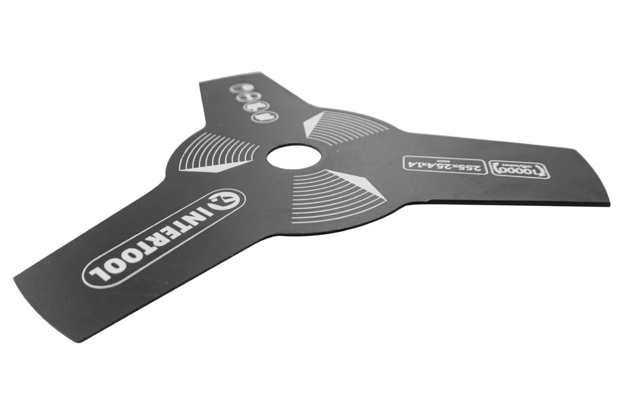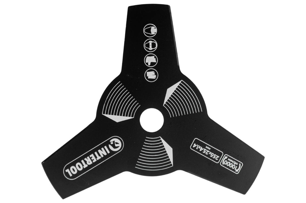 Диск для тримера Intertool є 3-зубчастим ножем з твердосплавними напайками, що має діаметр 255 мм - призначений для косіння трави, очерету, бур'яну з товстим діаметром стовбура, порослі біля дерев, чагарників і т. д. як на невеликих територіях (дачі, уса приватні будинки) і на великих площах.