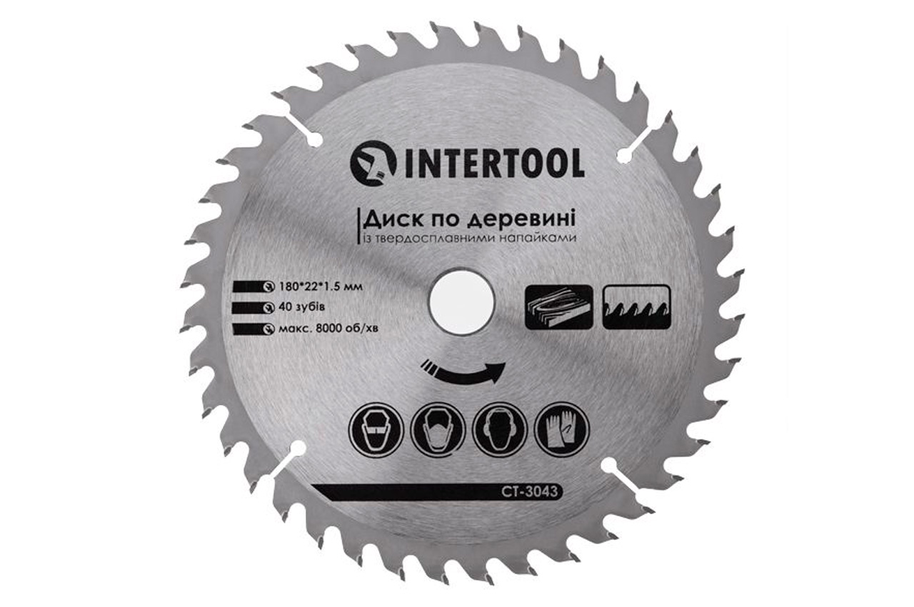 Пильний диск по дереву "Intertool" розрахований на роботу з УШМ, а також дисковими пилами. Завдяки застосуванню якісної інструментальної сталі і високоточного припою зубів, такі диски відрізняються високими експлуатаційними показниками. Самі зуби - виготовляються з вкрай твердого сплаву з точною алмазної шліфуванням. Зуби диска мають чергується нахил, що забезпечує точність і чистоту пропилу. Такі диски можна використовувати і для поздовжнього, і для поперечного розпилу деревини різної твердості. Так як диск має компенсаційні прорізи, він може витримувати високі температури при великій інтенсивності роботи, без деформації поверхні з мінімумом коливань, що дозволяє знизити безпосередню навантаження на рухомі частини обладнання. Розміри 180 x 22 мм і має 40 "зубів" напайками. Кількість зубів: 40; Діаметр диска: 180 мм; Ширина пропила: 2 мм; Геометрія зуба: ATB; Діаметр отвору: 22 мм; Товщина диска: 1.5 мм; Швидкість обертання: 8000 об / хв; Кут заточування: 12 град