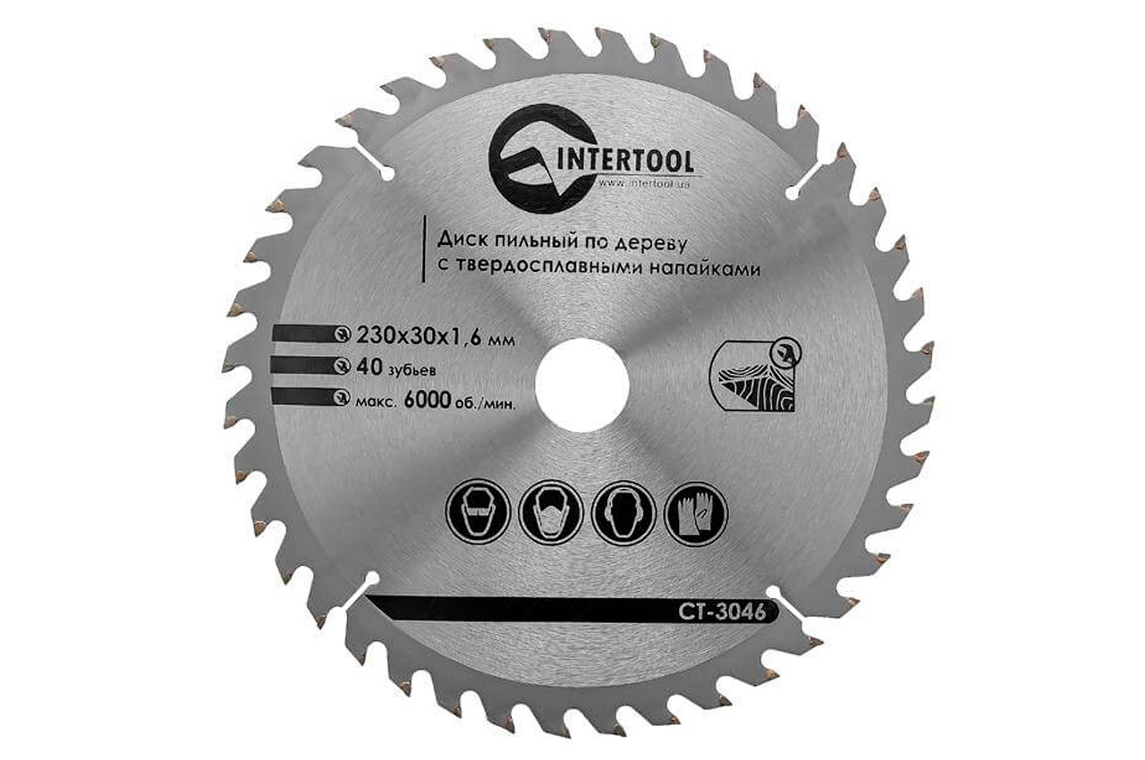 Пильний диск по дереву "Intertool" розрахований на роботу з УШМ, а також дисковими пилами. Завдяки застосуванню якісної інструментальної сталі і високоточного припою зубів, такі диски відрізняються високими експлуатаційними показниками. Самі зуби - виготовляються з вкрай твердого сплаву з точною алмазної шліфуванням. Зуби диска мають чергується нахил, що забезпечує точність і чистоту пропилу. Такі диски можна використовувати і для поздовжнього, і для поперечного розпилу деревини різної твердості. Так як диск має компенсаційні прорізи, він може витримувати високі температури при великій інтенсивності роботи, без деформації поверхні з мінімумом коливань, що дозволяє знизити безпосередню навантаження на рухомі частини обладнання. Розміри 30 x 30 мм і має 40 "зубів" напайками. Кількість зубів: 40; Діаметр диска: 230 мм; Ширина пропила: 2.2 мм; Геометрія зуба: ATB; Діаметр отвору: 30 мм; Товщина диска: 1.6 мм; Швидкість обертання: 6000 об / хв; Кут заточування: 12 град
