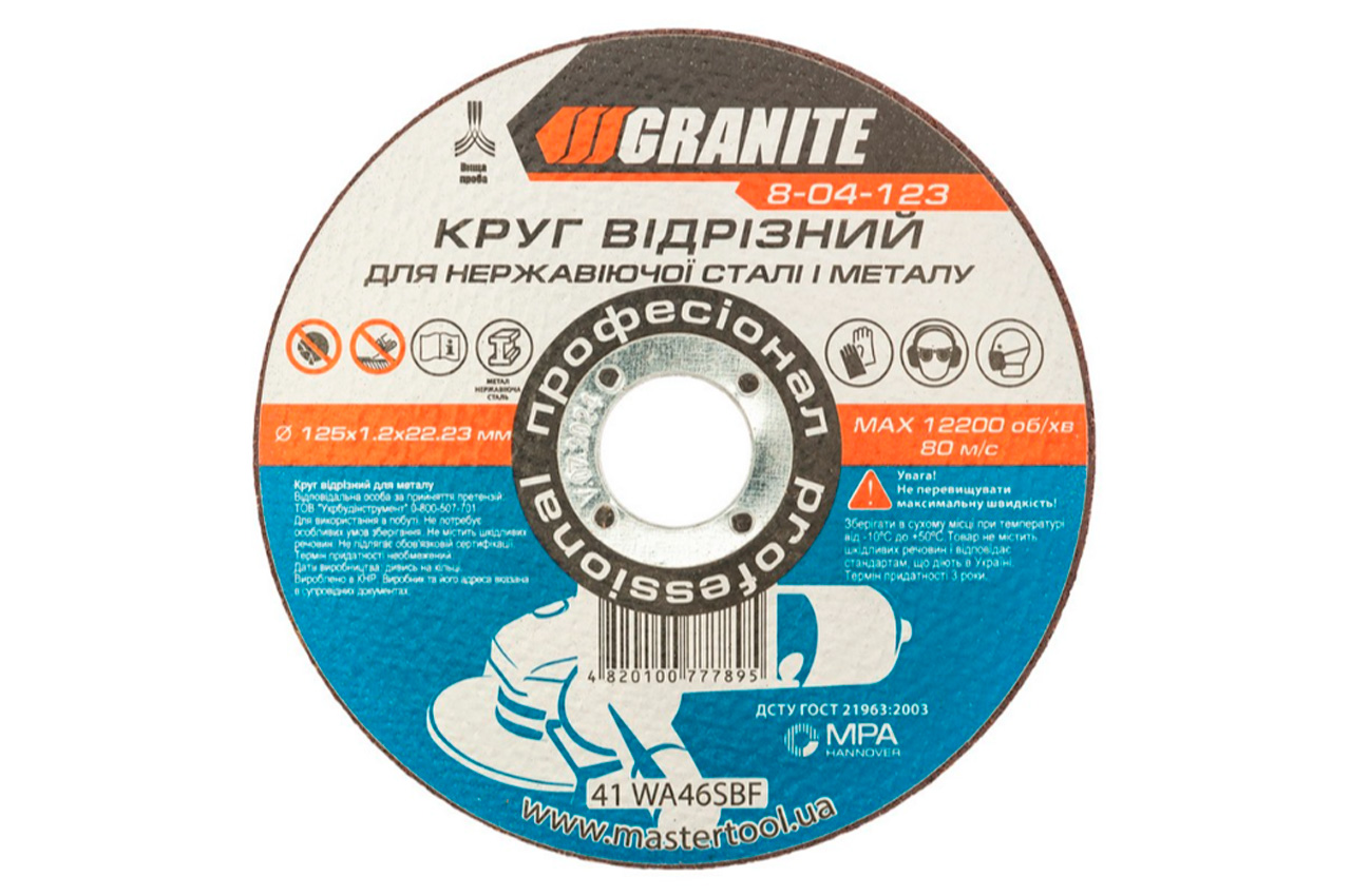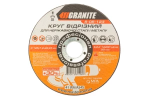 Диск відрізний по металу "Granite" призначений для використання в якості витратного матеріалу до УШМ для різання металу. Завдяки високоякісної армировочной нитки, яка рівномірно розподілена по всій структурі диска, досягається ідеальне балансування, що забезпечує чистий рез без задирок і пропалювання металу.