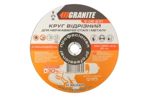 Диск відрізний по металу "Granite" призначений для використання в якості витратного матеріалу до УШМ для різання металу. Завдяки високоякісної армировочной нитки, яка рівномірно розподілена по всій структурі диска, досягається ідеальне балансування, що забезпечує чистий рез без задирок і пропалювання металу.