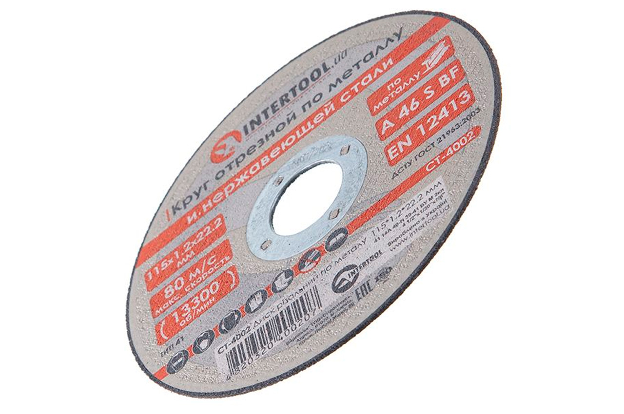 Круг відрізний по металу Intertool. Максимальна швидкість 80 м / с. Максимальна кількість обертів 13300 об / хв. Абразивний матеріал - оксид алюмінію на бакелітовій зв'язці. Застосовується для роботи з вуглецевою сталлю. Діаметр кола: 115 мм; Товщина кола: 1,2 мм; Діаметр отвору: 22,2 мм