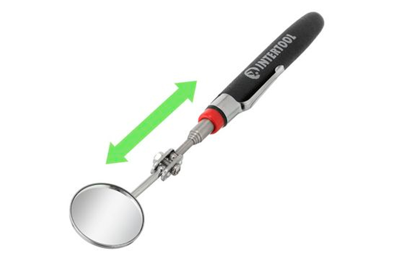 Інспекційне або оглядове дзеркало призначене для візуального огляду різної техніки, механізмів і пристроїв у важкодоступних місцях. Компактне дзеркало легко розкладається з 170 мм до 485 мм на необхідну довжину, завдяки телескопічній ручці. Діаметр дзеркала 31 мм, може бути встановлено під будь-яким кутом. Зручна рукоятка з м'якого пластику забезпечує зручних захоплення і не ковзає в руках. Довжина в складеному вигляді: 170 мм; Розмір: 31 мм