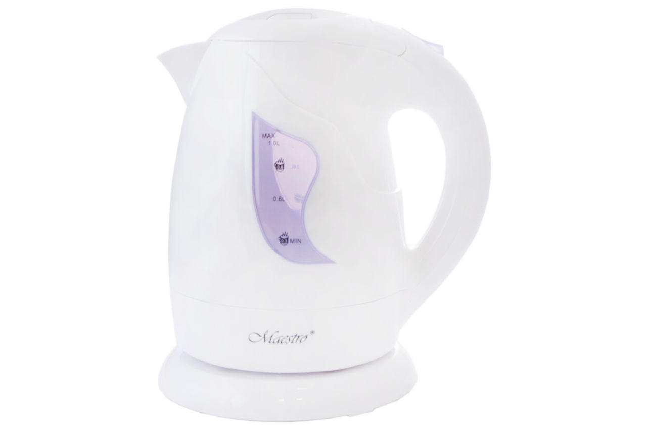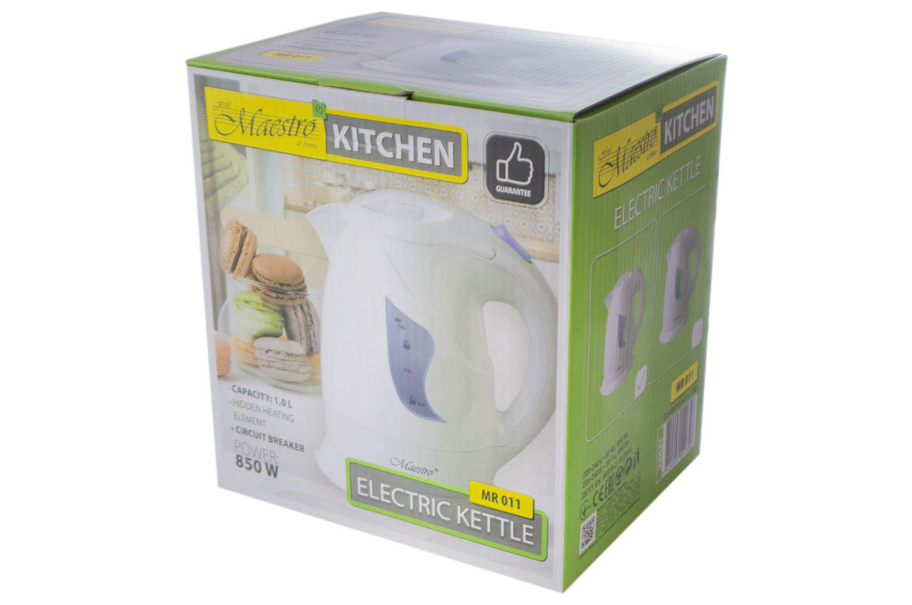 Електрочайник Maestro-MR-011 недорога функціональна модель для дому. Про увімкнення приладу повідомляє індикатор мережі. А індикатор рівня води дозволить візуально контролювати обсяг і доливати воду за необхідності до потрібної позначки. Показник потужності 850 Вт не перевищує можливості електромережі, на відміну від потужних моделей. Термостійкий пластиковий корпус не нагрівається, тому ризик отримати опік рук виключено. Об'єму в 1 літр буде достатньо для сім'ї із 3-4 осіб. Плоский нагрівальний елемент, який прихований під корпусом, кип'ятить воду набагато швидше, ніж моделі з ТЕНами. Захист від перегріву спрацює, якщо ви випадково забули долити в чайник води.