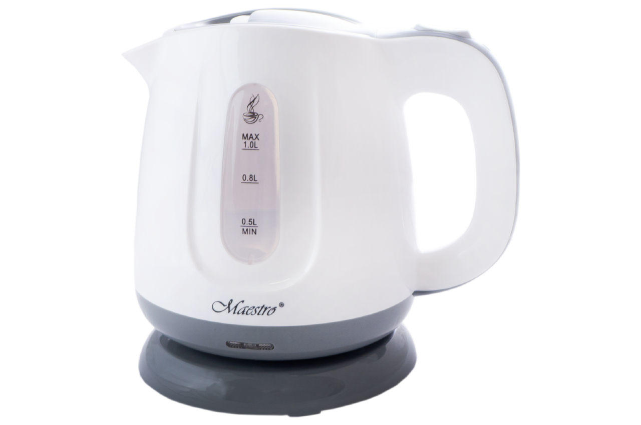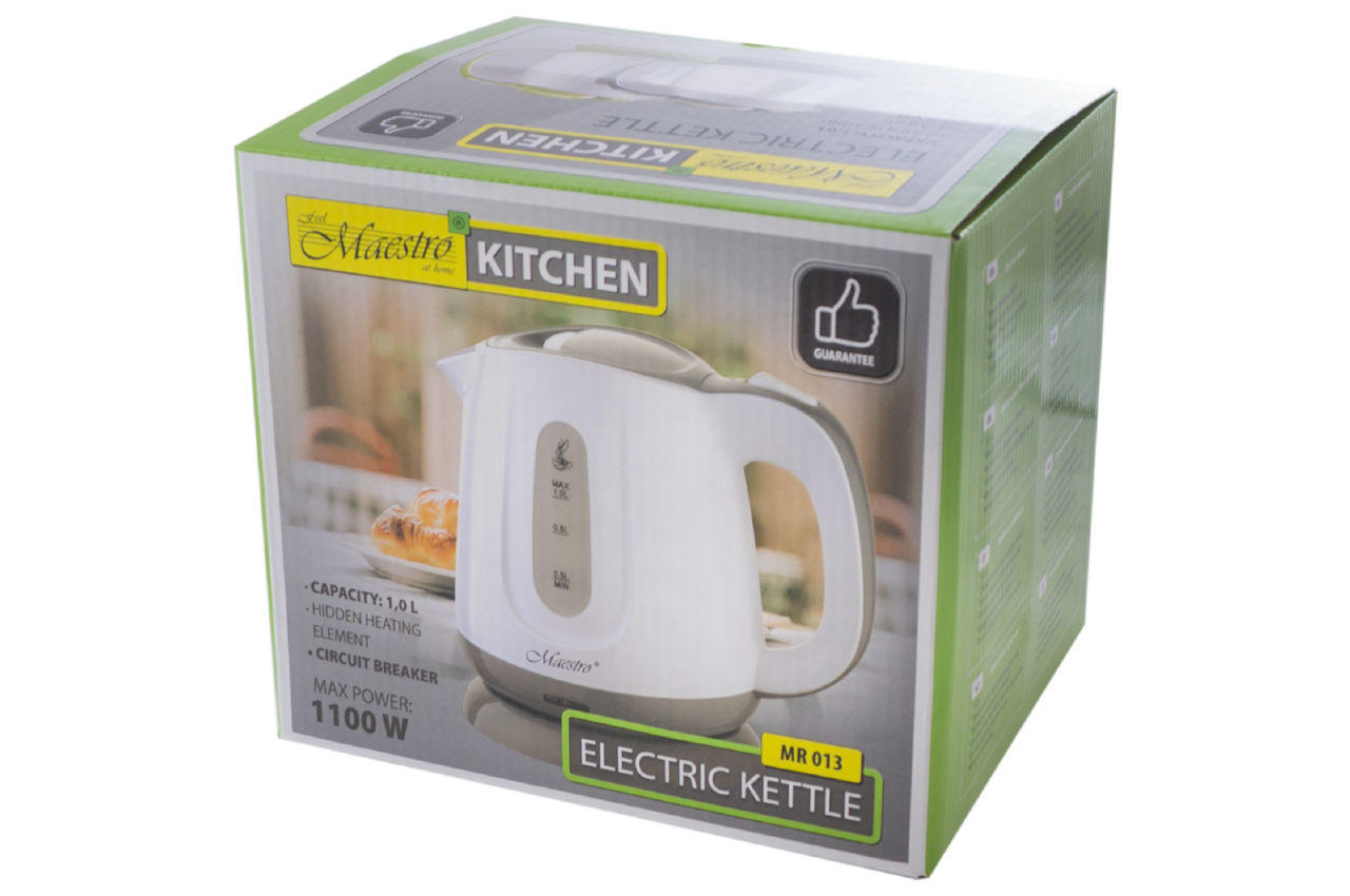 Електрочайник Maestro-MR-013 недорога функціональна модель для дому. Індикатор рівня води дозволить візуально контролювати об'єм та доливати воду за необхідності до потрібної позначки. Показник потужності 1100 Вт не перевищує можливості електромережі, на відміну від потужних моделей. Термостійкий пластиковий корпус не нагрівається, тому ризик отримати опік рук виключено. Об'єму в 1 літр буде достатньо для сім'ї із 3-4 осіб. Плоский нагрівальний елемент, який прихований під корпусом, кип'ятить воду набагато швидше, ніж моделі з Тенамі. Захист від перегріву спрацює, якщо ви випадково забули долити в чайник води.