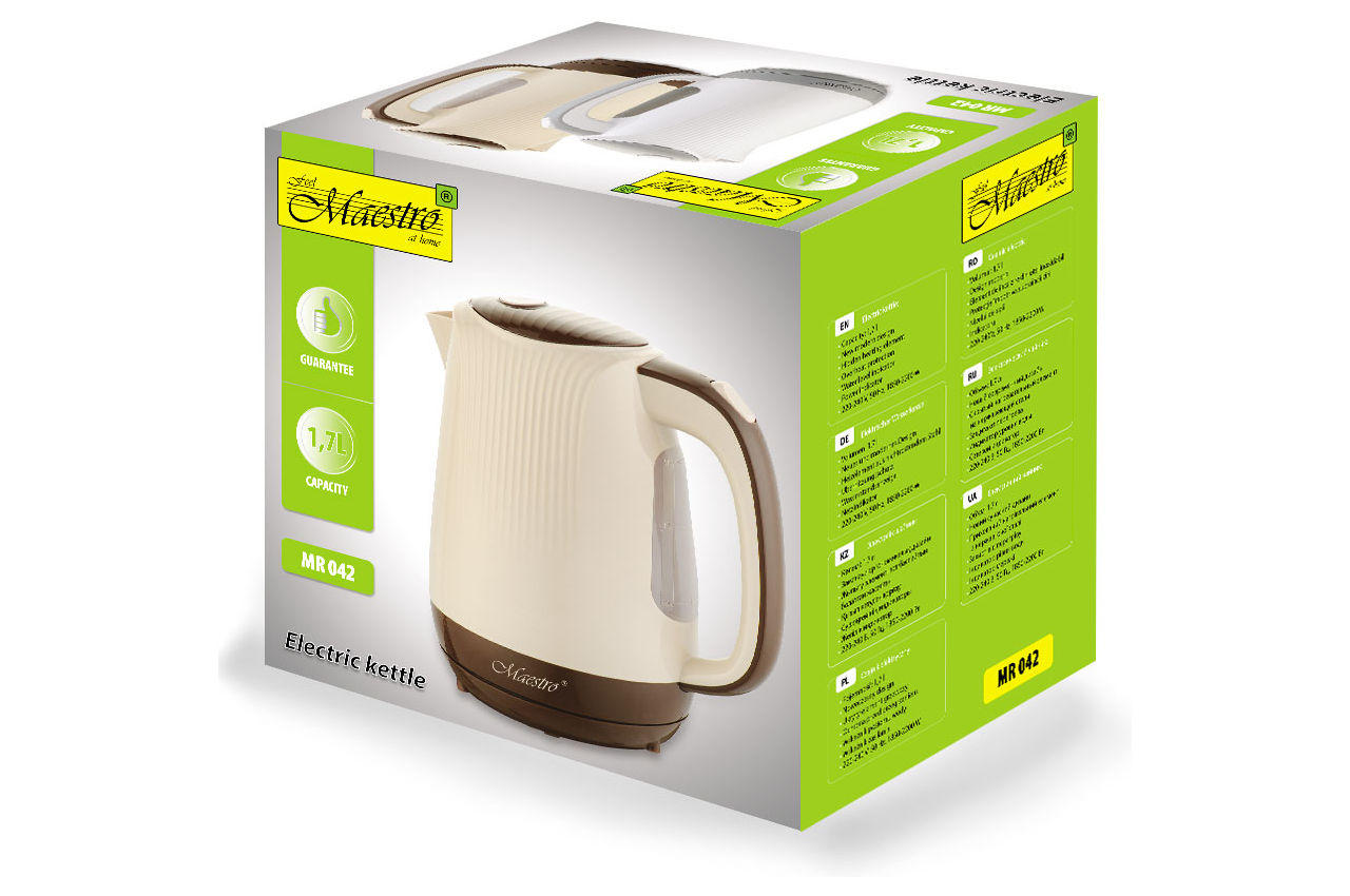 Електрочайник Maestro-MR-042 недорога функціональна модель для дому. Індикатор рівня води дозволить візуально контролювати об'єм та доливати воду за необхідності до потрібної позначки. Кришка відкривається лише натисканням кнопки. Показник потужності 2200 Вт не перевищує можливості електромережі, на відміну від потужніших моделей. Термостійкий пластиковий корпус не нагрівається, тому ризик отримати опік рук виключено. Об'єму в 1,7 літра вистачить для чаювання великої родини та гостей. Плоский нагрівальний елемент, який прихований під корпусом, кип'ятить воду набагато швидше, ніж моделі з ТЕНами. Захист від перегріву спрацює, якщо ви випадково забули долити в чайник води.