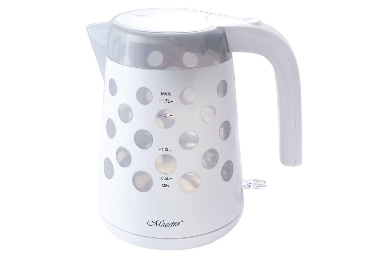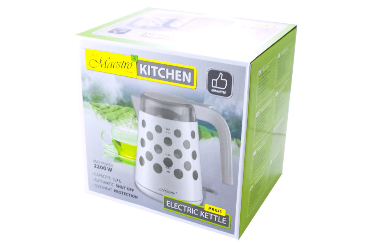 Електрочайник Maestro MR 045 - це стильний та сучасний прилад, який ідеально підходить для будь-якої кухні. Він має низку унікальних характеристик, які роблять його чудовим вибором для будь-якого користувача. Основні переваги електрочайника Maestro MR 045: Потужність 1850-2200 Вт забезпечує швидке закипання води. Дисковий нагрівальний елемент забезпечує рівномірне нагрівання води. Прикритий нагрівальний елемент є безпечним та довговічним. Матеріал корпусу: Термостійкий пластик є міцним та довговічним. Поворот на підставці на 360 ° забезпечує зручність використання. Функція автоматичного вимкнення запобігає перегріву чайника. Захист від перегріву запобігає пошкодженню чайника у разі закипання води без води.